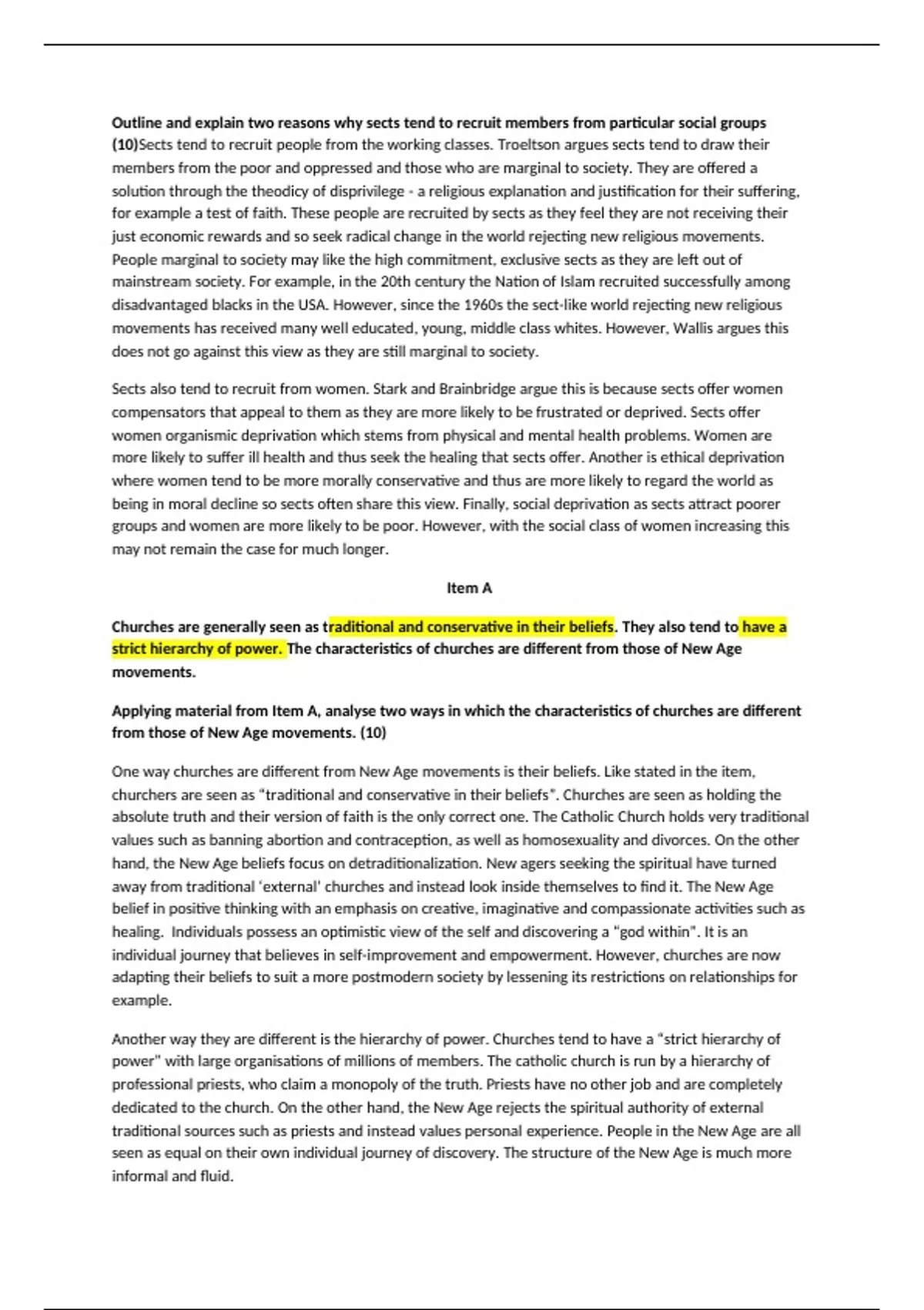 (10)Sects tend to recruit people from the working classes. Troeltson argues sects tend to draw their