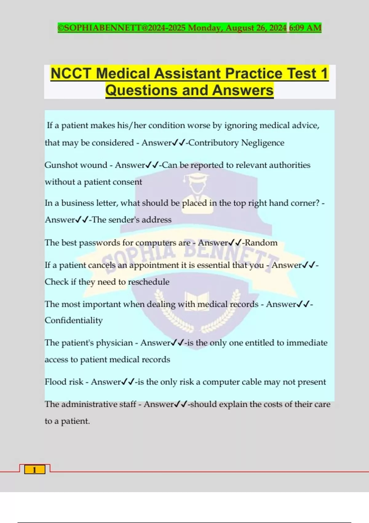 NCCT Medical Assistant Practice Test 1 Questions and Answers If a patient makes his/her condition worse by ignoring medical advice, that may be considered - Answer️️ -Contributory Negligence Gunshot wound - Answer️️ -Can be reported to relevant authorities without a patient consent In a business letter, what should be placed in the top right hand corner? - Answer️️ -The sender's address The best passwords for computers are - Answer️️ -Random If a patient cancels an appointment it is essential that you - Answer️️ - Check if they need to reschedule The most important when dealing with medical records - Answer️️ - Confidentiality The patient's physician - Answer️️ -is the only one entitled to immediate access to patient medical records Flood risk - Answer️️ -is the only risk a computer cable may not present The administrative staff - Answer️️ -should explain the costs of their care to a patient. ©SOPHIABENNETT@ Monday, August 26, 2024 6:09 AM 2 under what circumstances should a patient's blood be considered infective or infectious? - Answer️️ -In all circumstances Fluids presents the greatest risk of HIV infection to medical workers - Answer️️ -Blood In phlebotomy, what is a centrifuge used for - Answer