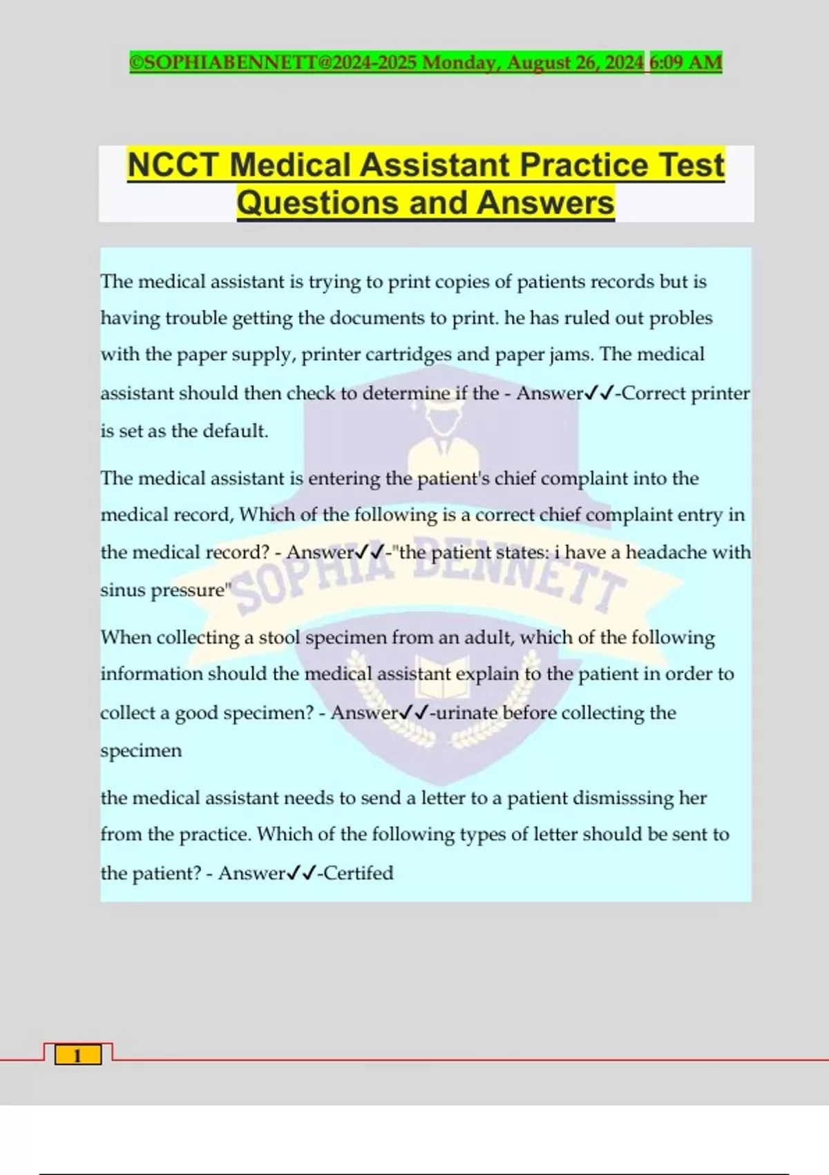 NCCT Medical Assistant Practice Test Questions and Answers The medical assistant is trying to print copies of patients records but is having trouble getting the documents to print. he has ruled out probles with the paper supply, printer cartridges and paper jams. The medical assistant should then check to determine if the - Answer️️ -Correct printer is set as the default. The medical assistant is entering the patient's chief complaint into the medical record, Which of the following is a correct chief complaint entry in the medical record? - Answer️️ -"the patient states: i have a headache with sinus pressure" When collecting a stool specimen from an adult, which of the following information should the medical assistant explain to the patient in order to collect a good specimen? - Answer️️ -urinate before collecting the specimen the medical assistant needs to send a letter to a patient dismisssing her from the practice. Which of the following types of letter should be sent to the patient? - Answer️️ -Certifed ©SOPHIABENNETT@ Monday, August 26, 2024 6:09 AM 2 Which of the following are considered mandatory documentation as per OSHA regulations for health care Facilities? - Answer️️ -MSDS, Proof of hazardous waste destruction, exposure of control plan Which of the following should the insurance and coding specialist use if a patient diagnosis fails to return to the office? - Answer️️ -Physician's suspected diagnosis The physician has ordered the patient to recieve a 20mg Vitamin B12 injection IM. The Vitamin B-12 comes in a vial with a concentration of 10 Mg/1cc (ml). The medical assistant should administer how many cc (ml) to the patient? - Answer️️ -2 Method of scheluding patients with similar appointment on a specific day or block of time is called - Answer️️ -cluster scheduling a medical assistant was ordered by a physician to obtain a blood specimen on a patient who has had a masectomy. Which of the following is the appropiate action to take? - Answer️️ -Draw the example from the arm opposite the masectomy A physician assistant asks the medical assistant to send a patient's medical information to the patient's PCP immediately. Which of the following should the medical assistant do to meet the PA's request? - Answer️️ - prepare a fax cover sheet to send SOAP notes. ©SOPHIABENNETT@ Monday, August 26, 2024 6:09 AM 3 A patient that does not look the medical assistant in the ye while speaking is most likely demonstrating - Answer️️ -A culture difference When answering the office phone, the medical assistant should - Answer️️ -Wait for a response before putting a caller on hold. a patient has come to the office with suspected pertussis. Which of the following actions should the medical assistant take? - Answer️️ -wear a facemask, wear a gown and gloves, immediately place the patient in an exam room with a closed door. which of the following patients should the medical assistant attend first? - Answer️️ -asthma attack when instructing a patient on the proper technique for using a metered dose inhaler, after shaking the inhaler and holding it upright the medical assistant should then have the patient - Answer️️ -inhale the medication slowly and hold her breath for 10 seconds which of the following are acceptable when documenting a correction into the patient's medical record? - Answer️️ -begin the corrected entry with correction or late entry, and reason...draw a single line through error, sign and date the entry. a medical assistant is administering oxygen via a nasal cannula. A repeat pulse oximetry reading is lower than the initial reading. The lik