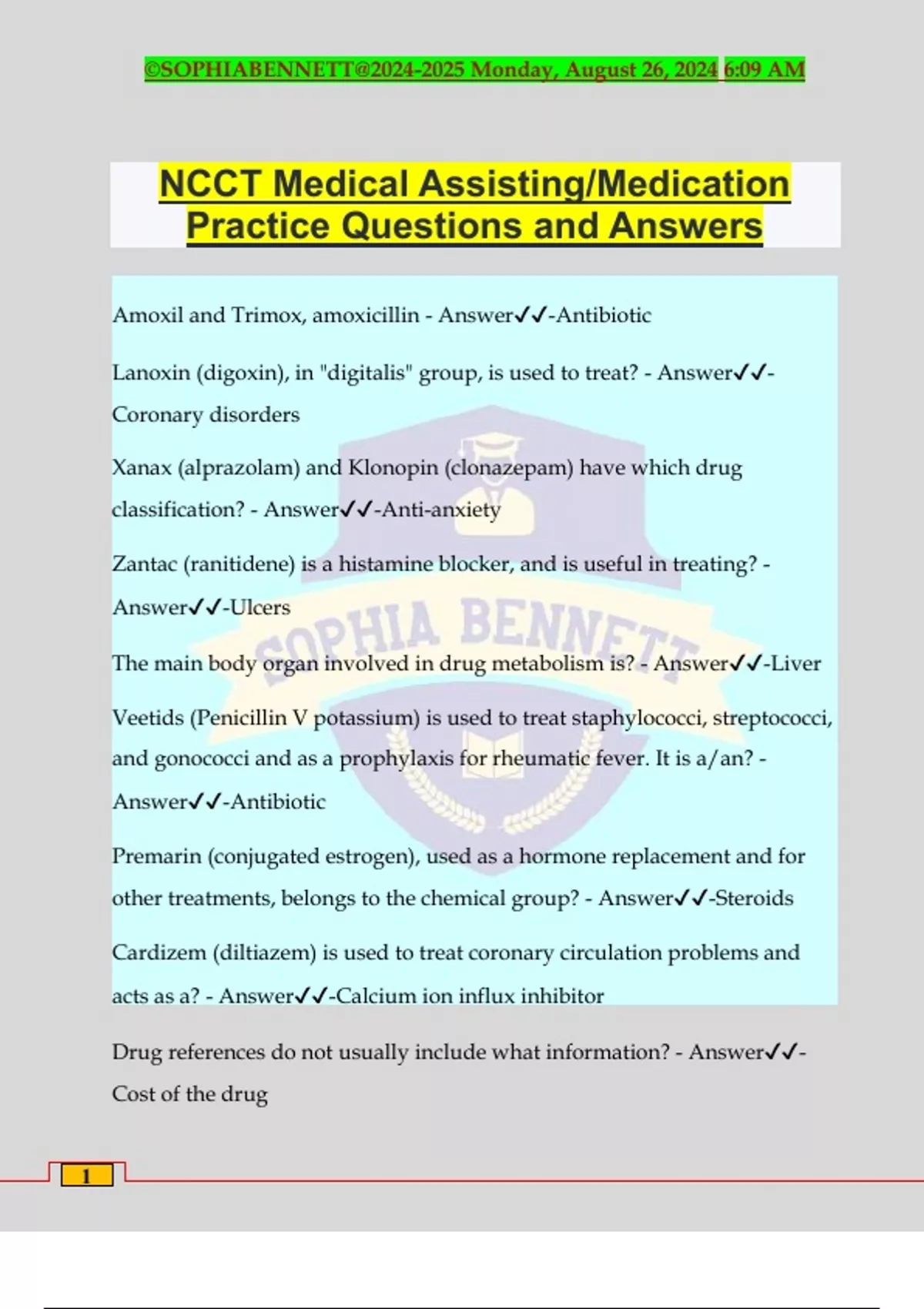 NCCT Medical Assisting/Medication Practice Questions and Answers Amoxil and Trimox, amoxicillin - Answer️️ -Antibiotic Lanoxin (digoxin), in "digitalis" group, is used to treat? - Answer️️ - Coronary disorders Xanax (alprazolam) and Klonopin (clonazepam) have which drug classification? - Answer️️ -Anti-anxiety Zantac (ranitidene) is a histamine blocker, and is useful in treating? - Answer️️ -Ulcers The main body organ involved in drug metabolism is? - Answer️️ -Liver Veetids (Penicillin V potassium) is used to treat staphylococci, streptococci, and gonococci and as a prophylaxis for rheumatic fever. It is a/an? - Answer️️ -Antibiotic Premarin (conjugated estrogen), used as a hormone replacement and for other treatments, belongs to the chemical group? - Answer️️ -Steroids Cardizem (diltiazem) is used to treat coronary circulation problems and acts as a? - Answer️️ -Calcium ion influx inhibitor Drug references do not usually include what information? - Answer️️ - Cost of the drug ©SOPHIABENNETT@ Monday, August 26, 2024 6:09 AM 2 Ceclor (cefaclor) is an? - Answer️️ -Antibiotic Prednisone is the generic name for a drug sold under the product names Orasone, Deltasone, and Meticorten. These drugs are classified as? - Answer️️ -Corticosteroids Synthroid and Levoxyl are two product names for the generic drug levothyroxine, which is a synthetic hormone replacement for the principal hormone secreted by the? - Answer️️ -Thyroid Accupril (quinapril hydrochloride) and Capoten (captopril) are used to treat? - Answer️️ -Hypertension Acetaminophen with codeine is an? - Answer️️ -Analgesic Pepcid (famotidine) is a drug used in the treatment of? - Answer️️ - Duodenal ulcer Cephalexin (the generic name for Keflex) is an anti-infective used in the treatment of? - Answer️️ -All the above (respiratory,genitourinary,skin,bone infections) Vasotec (enalapril) is? - Answer️️ -All the above (anti- hypertensive,lowers blood pressure, lessens resistance to b