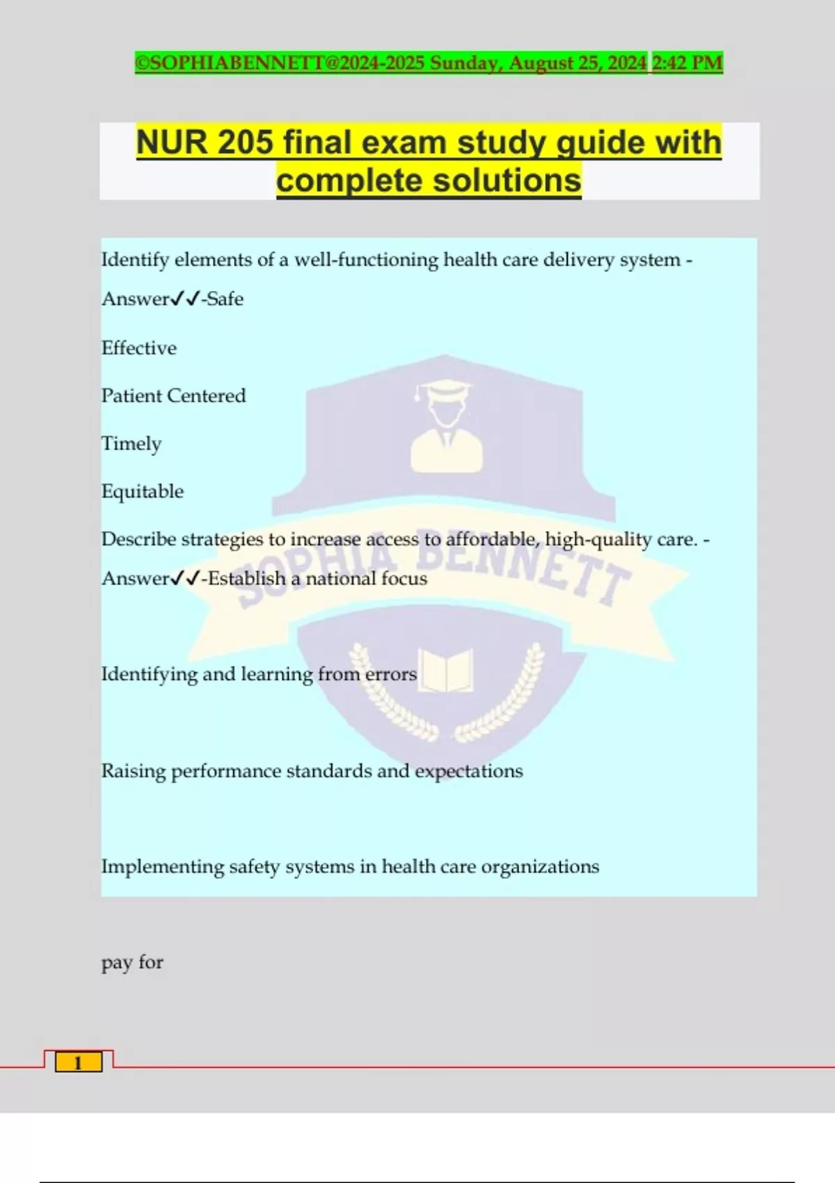 NUR 205 final exam study guide with complete solutions Identify elements of a well-functioning health care delivery system - Answer️️ -Safe Effective Patient Centered Timely Equitable Describe strategies to increase access to affordable, high-quality care. - Answer️️ -Establish a national focus Identifying and learning from errors Raising performance standards and expectations Implementing safety systems in health care organizations pay for ©SOPHIABENNETT@ Sunday, August 25, 2024 2:42 PM 2 performance penalties for excess readmissions Compare and contrast these health care delivery systems: physicians and hospitals - Answer️️ -Until recently, physicians were private/solo and had fee-for-service practice Most hospitals were not-for-profit, and physicians held a lot of power over hospitals because they were not employees Physicians had a lot of power because hospitals depended on physicians to admit patients or refer them for treatment The fee-for-service arrangement caused financial incentive for physicians doing more care, not necessarily better care Compare and contrast these health care delivery systems: multispecialty practice groups - Answer️️ --Late 1800s, Mayo Clinic founded in Rochester, MN. -Physicians of different specialties came together and shared income, expenses, facilities, ect. To provide better, more comprehensive care ©SOPHIABENNETT@ Sunday, August 25, 2024 2:42 PM 3 -Serve specific communities Compare and contrast these health care delivery systems: community health centers - Answer️️ --Regionalized services for vulnerable communities, emphasis on primary care and education. -Goal is for everyone to have access to care regardless of ability to pay. -Mary Breckenridge's clinic in rural KY was the first of its kind. -Nurses provide primary care. Compare and contrast these health care delivery systems: prepaid group practices - Answer️️ --Either no fee or co-payment required. -Goal of primary care is reducing costs by preventing illness. Popular with managed care of large employers. -HMOs (health maintenance organizations) allow subscribers to receive medical services required through a group of affiliated providers. -PPOs (preferred provider organizations), allow third party payer (insurance company) to work with a group of providers to provide cheaper services in return for prompt payment and guaranteed patient volumes ©SOPHIABENNETT@ Sunday, August 25, 2024 2:42 PM 4 Compare and contrast these health care delivery systems: accountable care organizations - Answer️️ --Originated from PPACA (patient protection and the affordable care act). -Provide incentives for doing well coordinated, integrated care instead of high volume of services. -Made up of hospitals, primary care settings, specialty care practices. Only one bill for all services received across all settings. Compare and contrast these health care delivery systems: medical homes - Answer️️ --Enhanced primary care model providing coordinated, comprehensive, whole-person care. -1960s, by American Academy of Pediatrics, became common in 2007 under PCMH (patient-centered _______ _____) view. -Advancement of nursing homes, raising standards since 2012. Compare and contrast these health care delivery systems: medical neighborhoods - Answer️️ -Agency for Healthcare Research and Quality (AHRQ) defines a ________ ______________ as: -a PCMH, and other clinicians, providing care for patients within the nursing home as well as community and service organizations as well as state and local public health agencies. ©SOPHIABENNETT@ Sunday, August 25, 2024 2:42 PM 5 -Focusing on individual patient care while also incorporating community health needs as well as aspects of population health. Evaluate four basic ways in which health care is paid for. - Answer️️ - Out-of-pocket payment Individual private insurance employer -based private insurance Government financing: Medicare - DRGs (diagnosis-related groups are payment plans that are based on patient classification categories) 65 and older Medicaid - People with very low income for people of any age Current budget considerations are to trim Medicaid expenditures by reducing benefits or placing patients into managed care programs. ©SOPHIABENNETT@ Sunday, August 25, 2024 2:42 PM 6 Compare and contrast settings and agencies that provide health care. - Answer️️ -AHRQ: (Agency for Healthcare Research and Quality) Their mission is to produce evidence, to make health care safer, higher quality, more accessible, equitable and affordable, and to work within the U.S. Department of Health and Human Services and with other partners to make sure that the evidence is understood and used. PCMH: (Patient Centered Medical Home) AHRQ definition: comprehensive care, patient-centered/coordinated care, accessible services, quality and safety Identify the members of the interdisciplinary healthcare team. - Answer️️ -Physician, physician assistant Nurse; unlicensed assistive personnel Physical, occupational, and respiratory therapist Dietician Speech Pathologist ©SOPHIABENNETT@ Sunday, August 25, 2024 2:42 PM 7 Social Worker Pharmacist Chaplain/ spiritual care provider Discuss selected trends and issues affecting healthcare delivery. - Answer️️ -Changing demographics Increasing diversity Technology explosion Globalization of economy and society Educated and engaged consumers