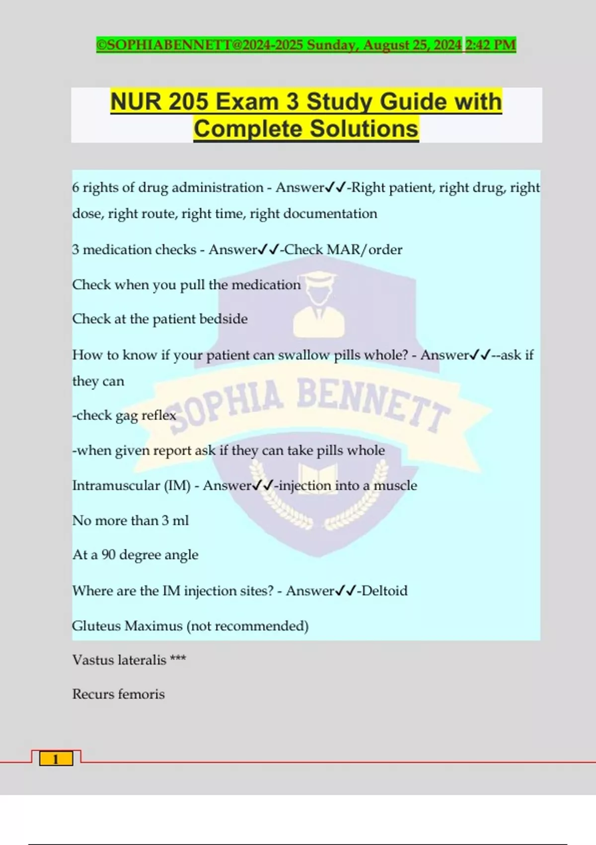 NUR 205 Exam 3 Study Guide with Complete Solutions 6 rights of drug administration - Answer️️ -Right patient, right drug, right dose, right route, right time, right documentation 3 medication checks - Answer️️ -Check MAR/order Check when you pull the medication Check at the patient bedside How to know if your patient can swallow pills whole? - Answer️️ --ask if they can -check gag reflex -when given report ask if they can take pills whole Intramuscular (IM) - Answer️️ -injection into a muscle No more than 3 ml At a 90 degree angle Where are the IM injection sites? - Answer️️ -Deltoid Gluteus Maximus (not recommended) Vastus lateralis *** Recurs femoris ©SOPHIABENNETT@ Sunday, August 25, 2024 2:42 PM 2 Subcutaneous injections - Answer️️ -Injection of a small amount of a medication under the skin into fatty or connective tissue 45-90 degree angle 1 ml fluid maximum Transdermal injection - Answer️️ -diffuse through the epidermis at a known rate into the dermis 5-15 degree angle Bevel up Pull skin back Make a "wheel" Endocrine system - Answer️️ -Glands secrete hormones that regulate processes such as growth, reproduction, and nutrient use (metabolism) by body cells. Insulin Hormone - Answer️️ -Necessary for carb regulation and glucose control Hormones - Answer️️ -Chemical messengers, mostly those manufactured by the endocrine glands, that are produce metabolic change Normal BS - Answer️️ -70-120 Fasting BS - Answer️️ -70-100 ©SOPHIABENNETT@ Sunday, August 25, 2024 2:42 PM 3 Pre-diabetic BS - Answer️️ -over 140 Mild Hypoglycemia Symptoms - Answer️️ -Hunger Nervousness Palpitations Sweating Tachycardia Tremor Moderate Hypoglycemia Symptoms - Answer️️ -Confusion Double Vision Drowsiness Emotional Changes Headache Impaired Coordination Inability to concentrate Irrational or combative behavior Lightheadedness Numbness of the lips and tongue Slurred speech ©SOPHIABENNETT@ Sunday, August 25, 2024 2:42 PM 4 Severe Hypoglycemia Symptoms - Answer️️ -Difficulty arousing Disoriented behavior Loss of consciousness Seizures Hyperglycemic Symptoms - Answer️️ -Polydipsia (increased thirst) Polyphasia (Increase hunger) Polyuria (increased urination) Warm, flushed skin Blurred vision Poor wound healing Diabetic Keto acidosis (DKA) - Answer️️ -Higher than 300 glucose Ketones in urine Kussmal breathing Acetone (fruity) breath Tachycardia N/V Severe abdominal pain DKA Treatments - Answer️️ -Rapid IV fluids ©SOPHIABENNETT@ Sunday, August 25, 2024 2:42 PM 5 IV Insulin/Drip Correct Electrolyte imbalance K+ and DKA - Answer️️ -K+ is elevated due to the dehydration and acidosis We must treat the imbalance quickly Diagnostic testing for diabetes - Answer️️ -Fasting BS A1C testing GAD Antibody testing lipid panel Renal function testing C-reactive protein GAD test - Answer️️ -An antibody test used for Type 1 diabetic patients. Either the patient will test positive or negative. HDL Cholesterol - Answer️️ -Good cholestero