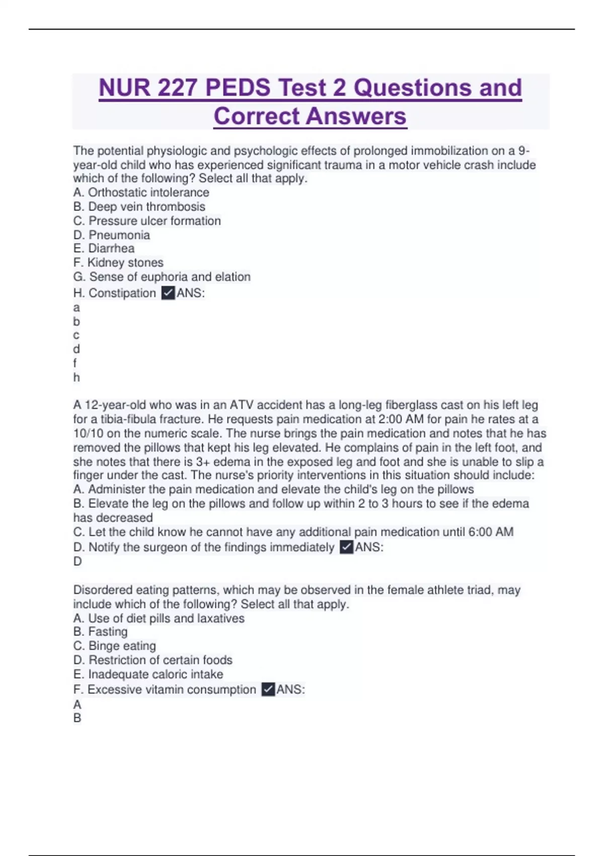 The potential physiologic and psychologic effects of prolonged immobilization on a 9-year-old child who has experienced significant trauma in a motor vehicle crash include which of the following? Select all that apply. A. Orthostatic intolerance B. Deep vein thrombosis C. Pressure ulcer formation D. Pneumonia E. Diarrhea F. Kidney stones G. Sense of euphoria and elation H. Constipation ANS: a b c d f h A 12-year-old who was in an ATV accident has a long-leg fiberglass cast on his left leg for a tibia-fibula fracture. He requests pain medication at 2:00 AM for pain he rates at a 10/10 on the numeric scale. The nurse brings the pain medication and notes that he has removed the pillows that kept his leg elevated. He complains of pain in the left foot, and she notes that there is 3+ edema in the exposed leg and foot and she is unable to slip a finger under the cast. The nurse's priority interventions in this situation should include: A. Administer the pain medication and elevate the child's leg on the pillows B. Elevate the leg on the pillows and follow up within 2 to 3 hours to see if the edema has decreased C. Let the child know he cannot have any additional pain medication until 6:00 AM D. Notify the surgeon of the findings immediately ANS: D Disordered eating patterns, which may be observed in the female athlete triad, may include which of the following? Select all that apply. A. Use of diet pills and laxatives B. Fasting C. Binge eating D. Restriction of certain foods E. Inadequate caloric intake F. Excessive vitamin consumption ANS: A B D E After the sudden death of a 14-year-old seemingly healthy basketball player, his parents ask the school administration to install an automatic external defibrillator (AED) in a central area of the athletic center. The school nurse is asked to participate in a meeting with the parents in which the administrators insist that such a device is not necessary. The school nurse advocates by providing which information about AEDs and children? A. An AED should be used only by health care persons trained in its use. B. An AED provides too much of an energy shock dose for children under 12 years of age. C. An AED can be effective in the resuscitation of a child or adolescent with a shockable rhythm. D. An AED is more commonly used in adults who have heart attacks than in children with undiagnosed heart conditions ANS: C A 2-day-old infant in the newborn nursery is diagnosed with developmental dysplasia of the hip, and treatment is started by the orthopedist. The nurse assists the parents by providing home care instructions that include: A. Return to the orthopedist's office in 2 weeks to remove the hip spica cast B. The infant's bilateral foot casts should be elevated on pillows as much as possible C. Remove the Pavlik harness once a day for no more than an hour and inspect skin D. Remove the Pavlik harness while the infant is awake to allow "tummy time" ANS: C The most common complication that should be anticipated and observed for in an infant with myelomeningocele after surgical repair of the defect is: A. Urinary stress B. Chiari malformation C. Hydrocephalus D. Latex allergy ANS: C A 14-year-old male with a spinal cord injury is placed on a standing table and suddenly begins to sweat profusely and complain of a headache. The nurse takes a set of vital signs and notes a significant increase in systolic blood pressure and a heart rate of 50 beats per minute. The most helpful intervention in this situation would be for the nurse to: A. Place the adolescent back in his wheelchair and take him to his room B. Palpate the bladder for distention C. Administer a routine analgesic for his headache and discontinue the therapy D. Place the standing table in a horizontal position and allow the adolescent to rest for a few minut ANS: B