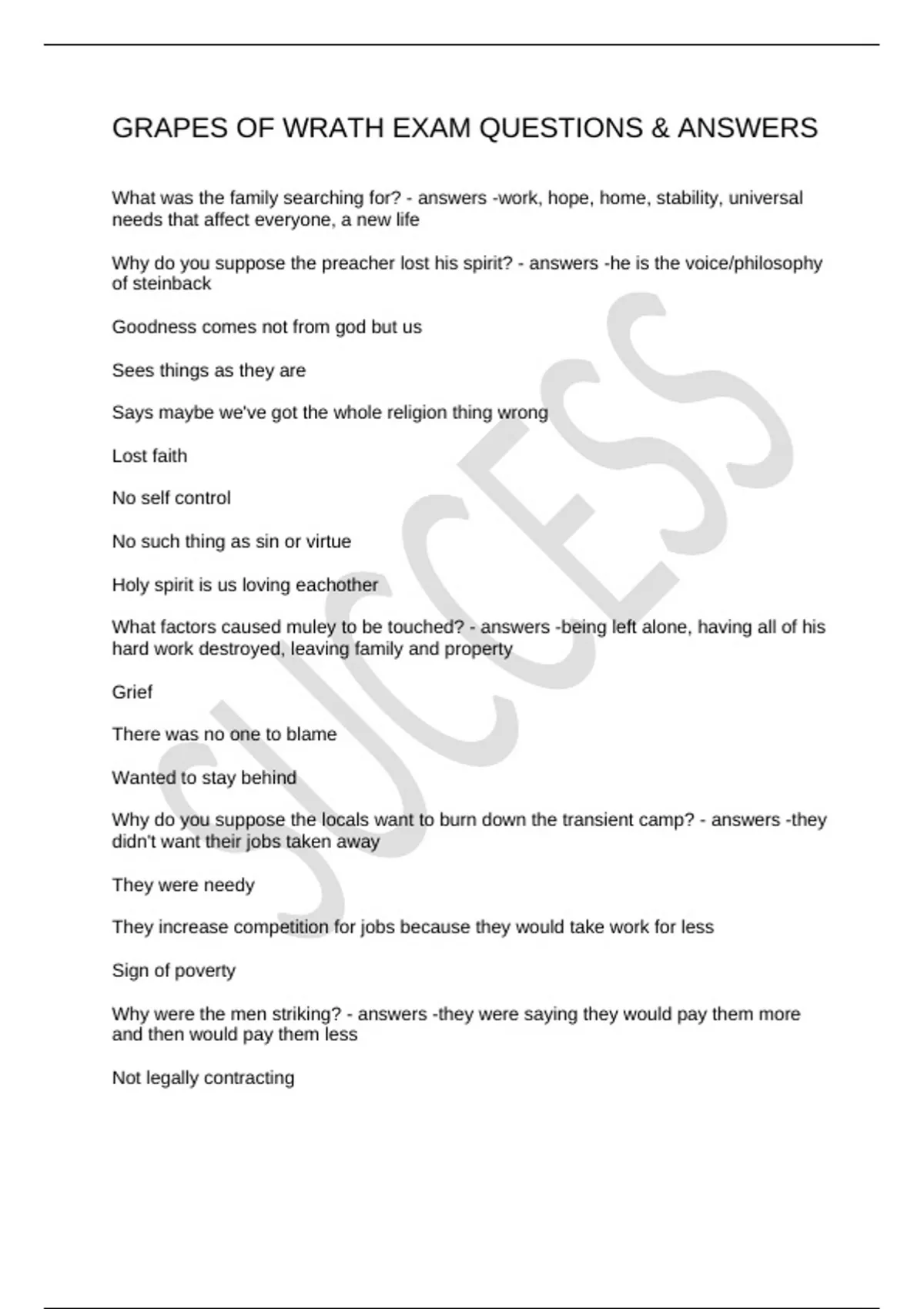 GRAPES OF WRATH EXAM QUESTIONS & ANSWERS