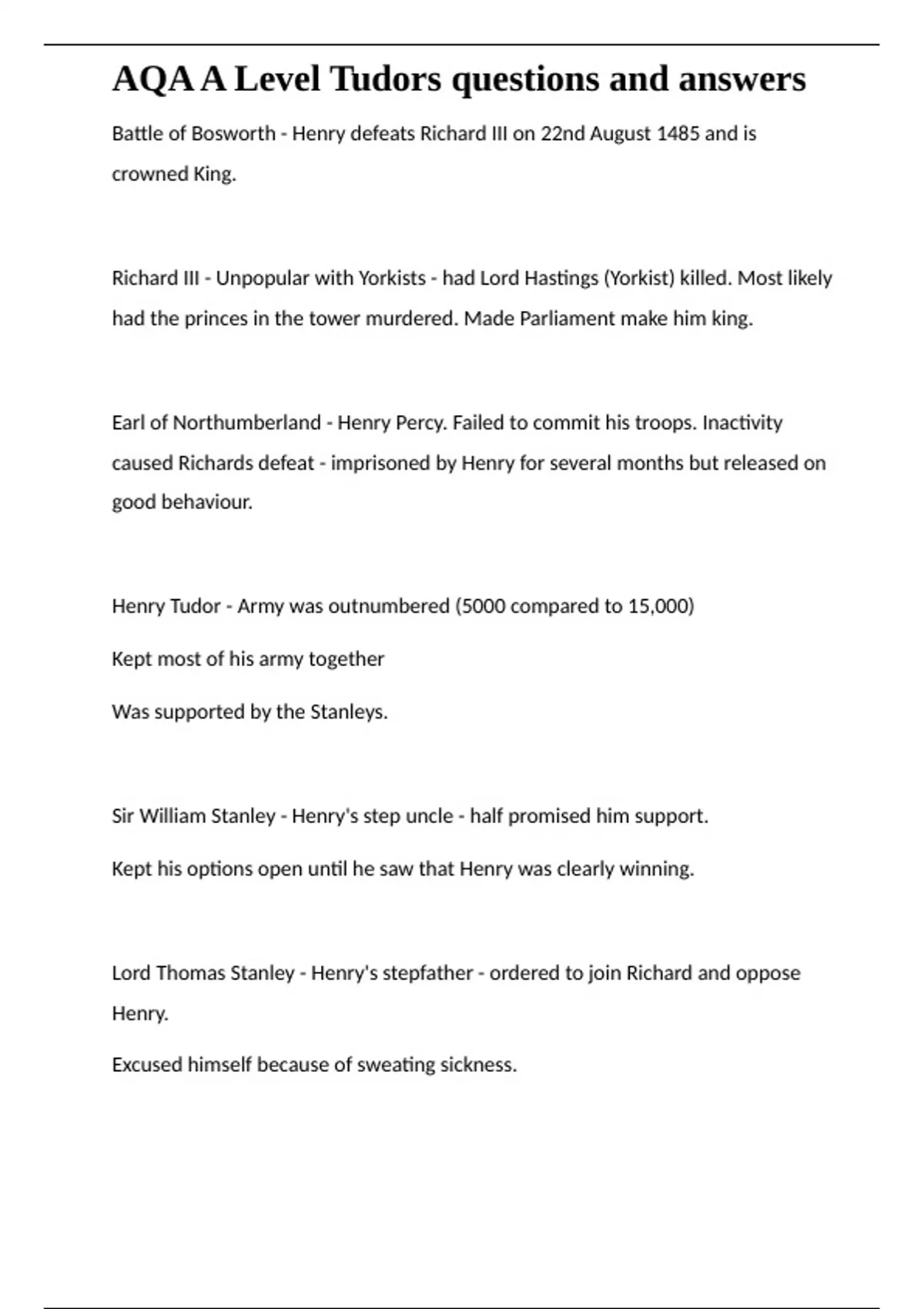 Lord Thomas Stanley - Henry's stepfather - ordered to join Richard and oppose