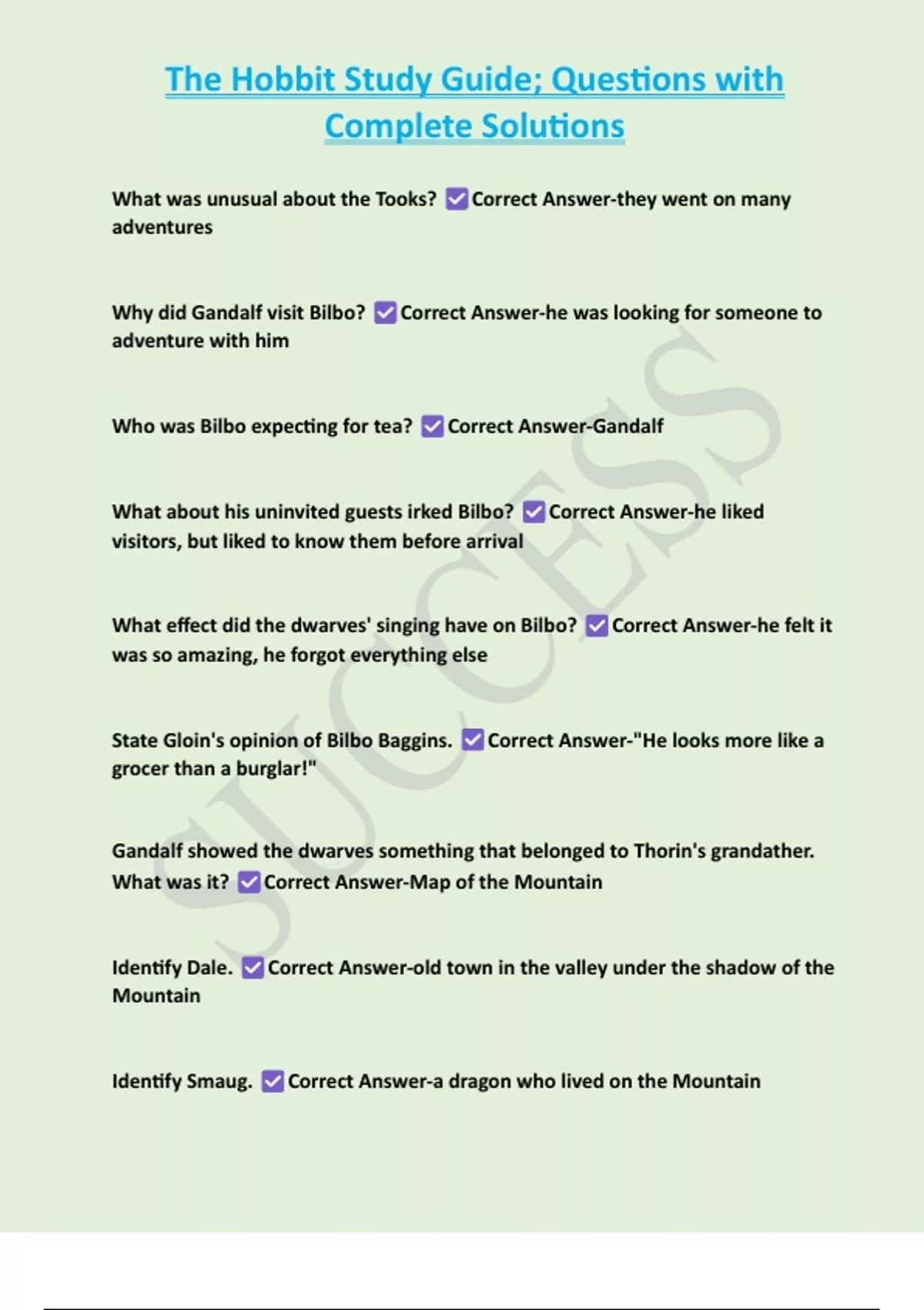 The Hobbit Study Guide; Questions with Complete Solutions What was unusual about the Tooks? Correct Answer-they went on many adventures Why did Gandalf visit Bilbo? Correct Answer-he was looking for someone to adventure with him Who was Bilbo expecting for tea? Correct Answer-Gandalf