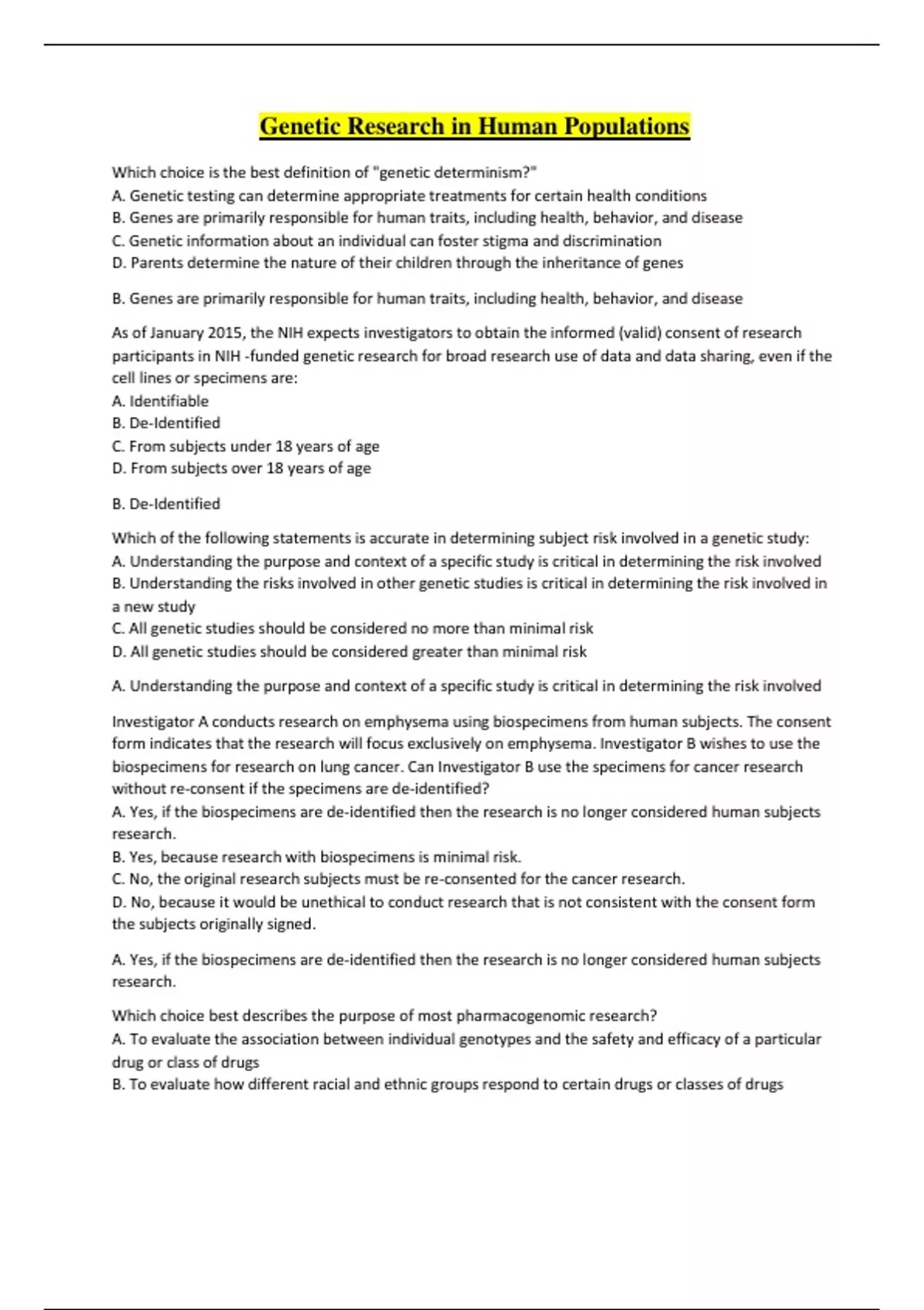 Genetic Research in Human Populations Which choice is the best definition of "genetic determinism?" A. Genetic testing can determine appropriate treatments for certain health conditions B. Genes are primarily responsible for human traits, including health, behavior, and disease C. Genetic information about an individual can foster stigma and discrimination D. Parents determine the nature of their children through the inheritance of genes B. Genes are primarily responsible for human traits, including health, behavior, and disease As of January 2015, the NIH expects investigators to obtain the informed (valid) consent of research participants in NIH -funded genetic research for broad research use of data and data sharing, even if the cell lines or specimens are: A. Identifiable B. De-Identified C. From subjects under 18 years of age D. From subjects over 18 years of age B. De-Identified Which of the following statements is accurate in determining subject risk involved in a genetic study: A. Understanding the purpose and context of a specific study is critical in determining the risk involved B. Understanding the risks involved in other genetic studies is critical in determining the risk involved in a new study C. All genetic studies should be considered no more than minimal risk D. All genetic studies should be considered greater than minimal risk A. Understanding the purpose and context of a specific study is critical in determining the risk involved Investigator A conducts research on emphysema using biospecimens from human subjects. The consent form indicates that the research will focus exclusively on emphysema. Investigator B wishes to use the biospecimens for research on lung cancer. Can Investigator B use the specimens for cancer research without re-consent if the specimens are de-identified? A. Yes, if the biospecimens are de-identified then the research is no longer considered human subjects research. B. Yes, because research with biospecimens is minimal risk. C. No, the original research subjects must be re-consented for the cancer research. D. No, because it would be unethical to conduct research that is not consistent with the consent form the subjects originally signed. A. Yes, if the biospecimens are de-identified then the research is no longer considered human subjects research. Which choice best describes the purpose of most pharmacogenomic research? A. To evaluate the association between individual genotypes and the safety and efficacy of a particular drug or class of drugs B. To evaluate how different racial and ethnic groups respond to certain drugs or classes of drugs C. To evaluate how the genomes of infectious agents impact the efficacy of certain antibiotics D. To evaluate whether genetic testing can reduce the cost of pharmaceuticals A. To evaluate the association between individual genotypes and the safety and efficacy of a particular drug or class of drugs