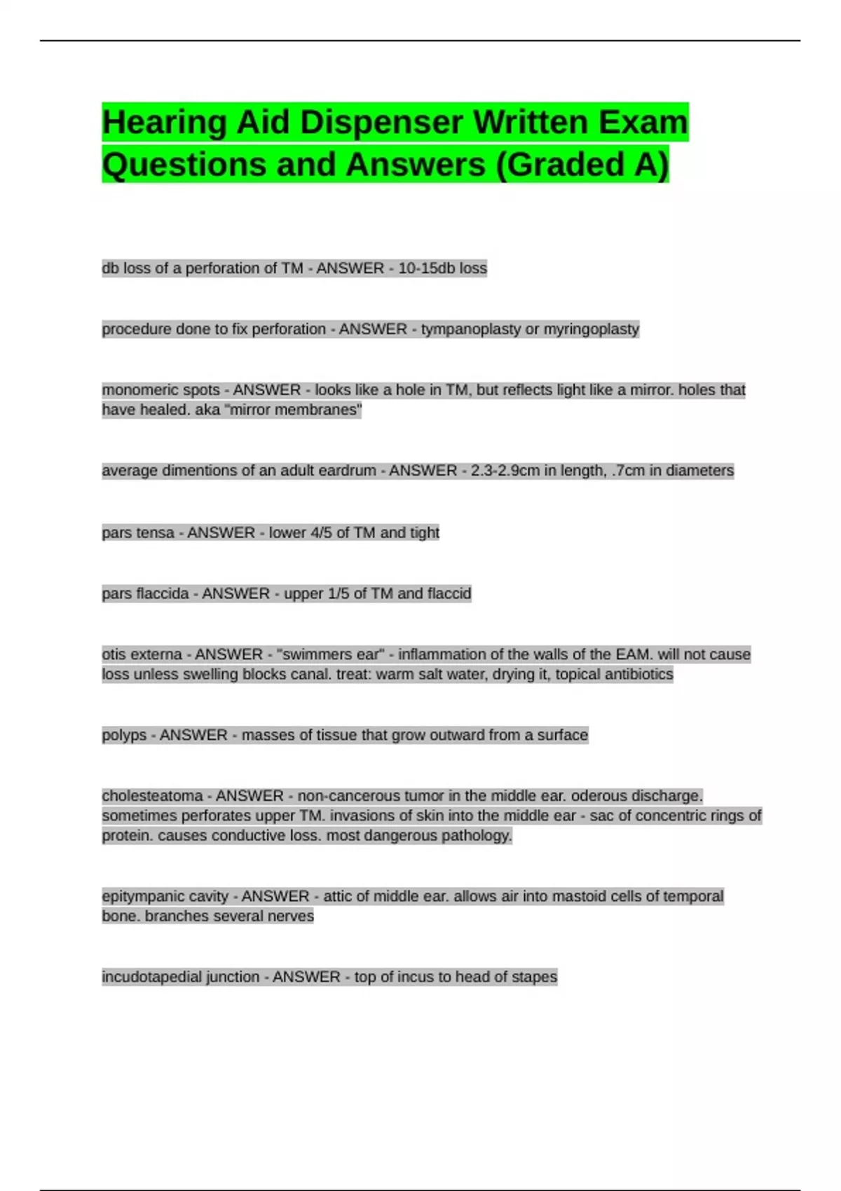 Hearing Aid Dispenser Written Exam Questions and Answers (Graded A)Hearing Aid Dispenser Written Exam Questions and Answers (Graded A)Hearing Aid Dispenser Written Exam Questions and Answers (Graded A)Hearing Aid Dispenser Written Exam Questions and Answers (Graded A)db loss of a perforation of TM - ANSWER - 10-15db loss procedure done to fix perforation - ANSWER - tympanoplasty or myringoplasty monomeric spots - ANSWER - looks like a hole in TM, but reflects light like a mirror. holes that have healed. aka "mirror membranes" average dimentions of an adult eardrum - ANSWER - 2.3-2.9cm in length, .7cm in diameters