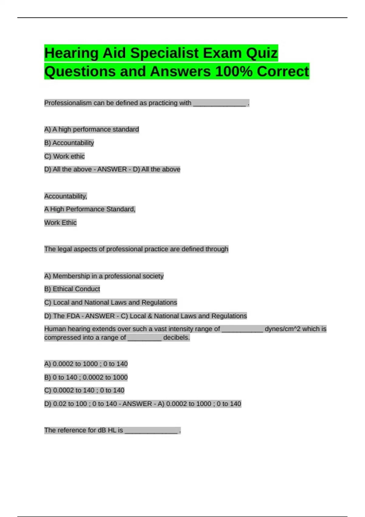 Hearing Aid Specialist Exam Quiz Questions and Answers 100% CorrectHearing Aid Specialist Exam Quiz Questions and Answers 100% CorrectHearing Aid Specialist Exam Quiz Questions and Answers 100% CorrectHearing Aid Specialist Exam Quiz Questions and Answers 100% CorrectProfessionalism can be defined as practicing with ______________ . A) A high performance standard B) Accountability C) Work ethic D) All the above - ANSWER - D) All the above Accountability, A High Performance Standard, Work Ethic The legal aspects of professional practice are defined through