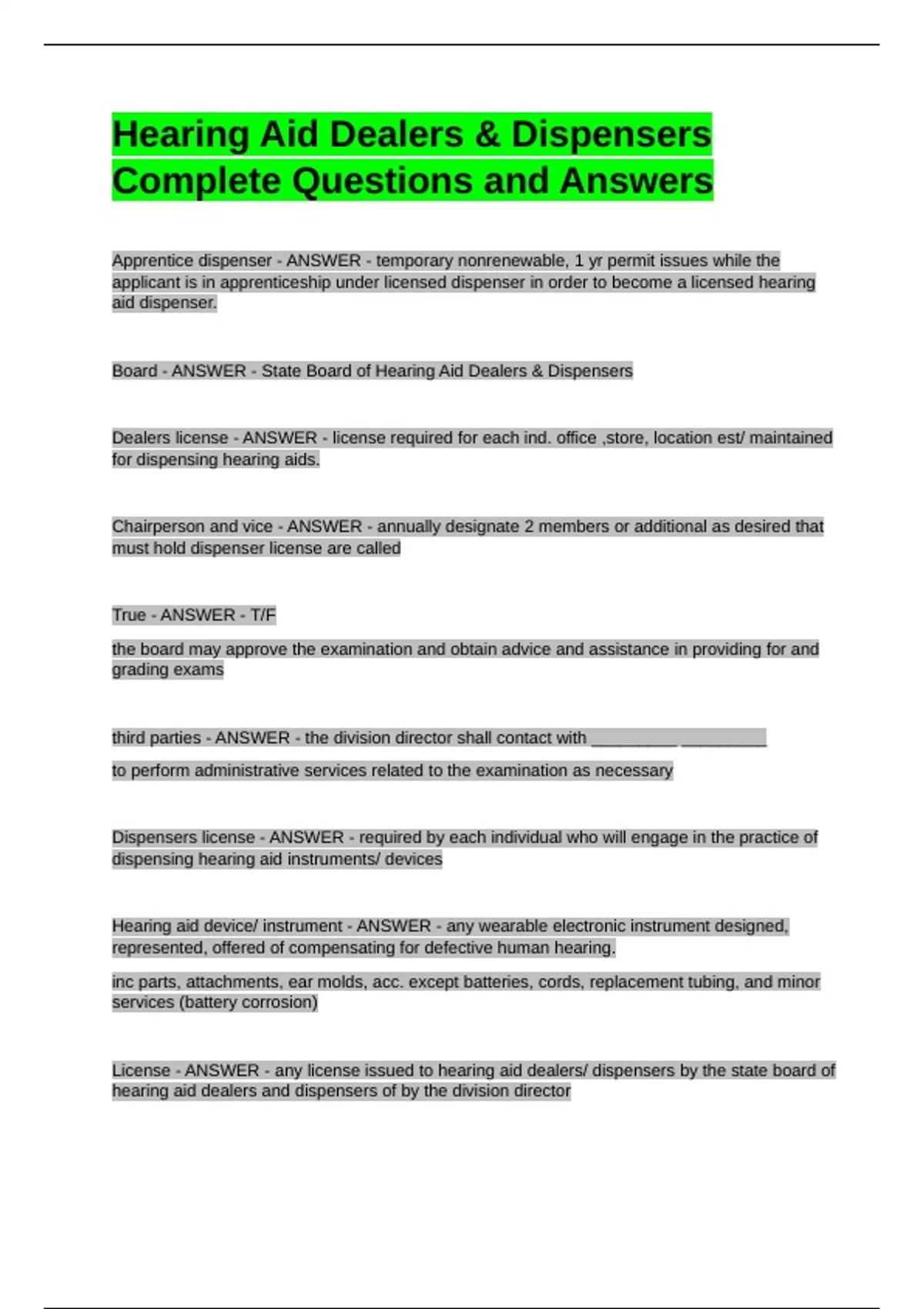 Hearing Aid Dealers & Dispensers Complete Questions and AnswersHearing Aid Dealers & Dispensers Complete Questions and AnswersHearing Aid Dealers & Dispensers Complete Questions and AnswersHearing Aid Dealers & Dispensers Complete Questions and AnswersApprentice dispenser - ANSWER - temporary nonrenewable, 1 yr permit issues while the applicant is in apprenticeship under licensed dispenser in order to become a licensed hearing aid dispenser. Board - ANSWER - State Board of Hearing Aid Dealers & Dispensers Dealers license - ANSWER - license required for each ind. office ,store, location est/ maintained for dispensing hearing aids. Chairperson and vice - ANSWER - annually designate 2 members or additional as desired that must hold dispenser license are called