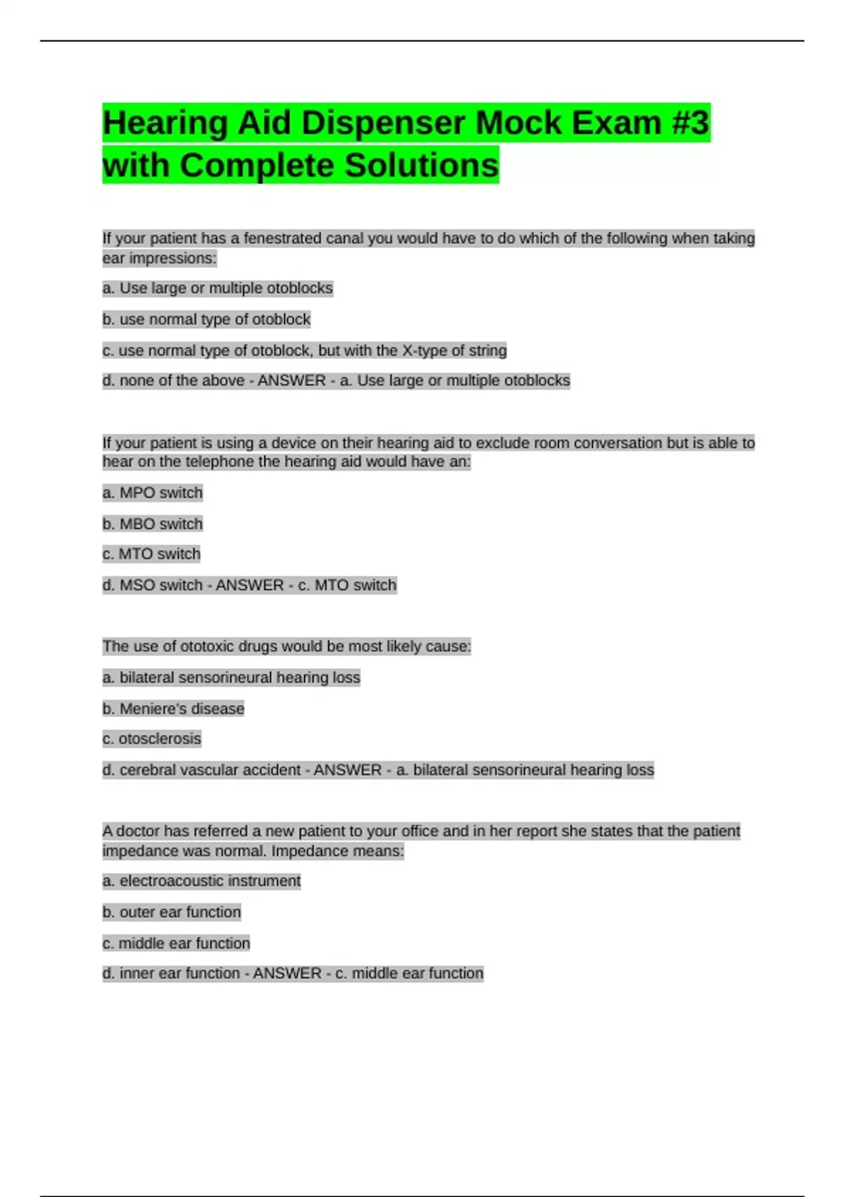 Hearing Aid Dispenser Mock Exam #3 with Complete SolutionsHearing Aid Dispenser Mock Exam #3 with Complete SolutionsHearing Aid Dispenser Mock Exam #3 with Complete SolutionsHearing Aid Dispenser Mock Exam #3 with Complete Solutions If your patient has a fenestrated canal you would have to do which of the following when taking ear impressions: a. Use large or multiple otoblocks b. use normal type of otoblock c. use normal type of otoblock, but with the X-type of string d. none of the above - ANSWER - a. Use large or multiple otoblocks If your patient is using a device on their hearing aid to exclude room conversation but is able to hear on the telephone the hearing aid would have an: a. MPO switch b. MBO switch