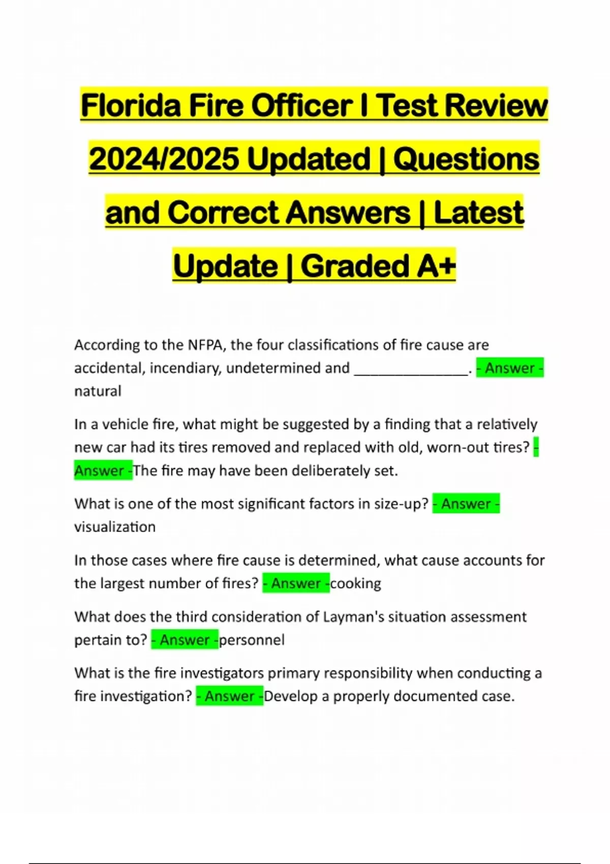 Florida Fire Officer I Test Review 2024/2025 Updated | Questions and Correct Answers | Latest Update | Graded A+ According to the NFPA, the four classifications of fire cause are accidental, incendiary, undetermined and ______________. - Answer - natural In a vehicle fire, what might be suggested by a finding that a relatively new car had its tires removed and replaced with old, worn-out tires? - Answer -The fire may have been deliberately set. What is one of the most significant factors in size-up? - Answer - visualization In those cases where fire cause is determined, what cause accounts for the largest number of fires? - Answer -cooking What does the third consideration of Layman's situation assessment pertain to? - Answer -personnel What is the fire investigators primary responsibility when conducting a fire investigation? - Answer -Develop a properly documented case.When conducting an incident review for an incident involving a building fire, the process should begin with _________________. - Answer -a review of the building An _________________ is used when an individual who is attempting to conceal information is being questioned. - Answer -interrogation If it becomes clear to fire officers that the assigned tasks are ineffective, when should they relay that information to Command? - Answer -as soon as they realize it What acronym is used for a systematic method of accounting for all personnel at an emergency incident? - A