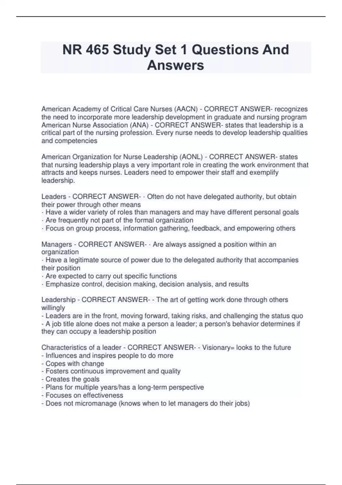 American Nurse Association (ANA) - CORRECT ANSWER- states that leadership is a