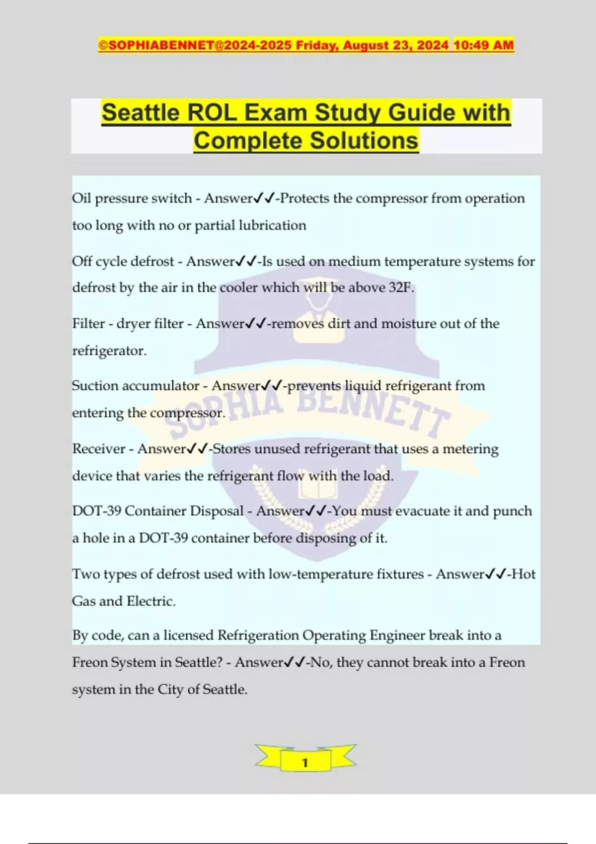 Seattle ROL Exam Study Guide with Complete Solutions Oil pressure switch - Answer️️ -Protects the compressor from operation too long with no or partial lubrication Off cycle defrost - Answer️️ -Is used on medium temperature systems for defrost by the air in the cooler which will be above 32F. Filter - dryer filter - Answer️️ -removes dirt and moisture out of the refrigerator. Suction accumulator - Answer️️ -prevents liquid refrigerant from entering the compressor. Receiver - Answer️️ -Stores unused refrigerant that uses a metering device that varies the refrigerant flow with the load. DOT-39 Container Disposal - Answer️️ -You must evacuate it and punch a hole in a DOT-39 container before disposing of it. Two types of defrost used with low-temperature fixtures - Answer️️ -Hot Gas and Electric. By code, can a licensed Refrigeration Operating Engineer break into a Freon System in Seattle? - Answer️️ -No, they cannot break into a Freon system in the City of Seattle. ©SOPHIABENNET@ Friday, August 23, 2024 10:49 AM 2 High temperature refrigeration is between - Answer️️ -45F to 60F Medium temperature refrigeration is between - Answer️️ -30F to 45F Low temperature refrigeration is between - Answer️️ --20F to 5F The average coil to air temperature relationship of the evaporators is 15F differences leaving air and boiling refrigeration temperature. - Answer️️ - HCFC are HydroChloroFlouroCarbons and contain - Answer️️ -Contain the elements, hydrogen, chlorine, fluorine, and carbon. HFC are HydroFlouroCarbons and contain - Answer️️ -Hydrogen, fluorine, and carbons. Ozone Depletion Potential - Answer️️ -Is a measurement of CFC's and HCFC's ability to destroy the ozone. A white colored cylinder is used for - Answer️️ -R-12. A silver colored cylinder is used for - Answer️️ -R-717. On a gauge manifold the red hose is to be connected to - Answer️️ -The high side. On a gauge manifold the blue hose is to be connected to - Answer️️ -The low side. Volume of gas varies as pressure varies, but the temperature remains the same. - Answer️️ -Boyle's law ©SOPHIABENNET@ Friday, August 23, 2024 10:49 AM 3 The total pressure of a confined mixture of gases is the sum of the pressures of each of the gasses in the mixture. - Answer️️ -Dalton's law At a constant pressure, the volume of gas varies as to the absolute temperature and at a constant volume, the pressure of a gas varies directly with the absolute temperature. - Answer️️ -Charles' law A rupture disk is located - Answer️️ -On the cooler of a chiller. To test for leaks in an ammonia system - Answer️️ -You can use a sulfur candle and soap bubbles. Before you dispose of a refrigeration container - Answer️️ -You must evacuate, puncture a hole in the container; break off the valve of a refrigeration container. All refrigerant technicians must be certified after - Answer️️