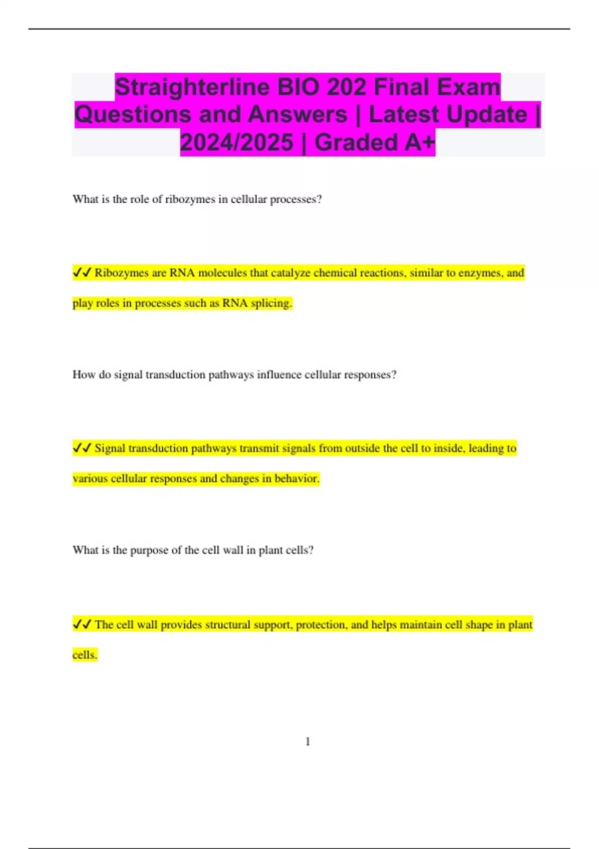 Straighterline BIO 202 Final Exam Questions and Answers | Latest Update | 2024/2025 | Graded A+ What is the role of ribozymes in cellular processes? Ribozymes are RNA molecules that catalyze chemical reactions, similar to enzymes, and play roles in processes such as RNA splicing. How do signal transduction pathways influence cellular responses? Signal transduction pathways transmit signals from outside the cell to inside, leading to various cellular responses and changes in behavior. What is the purpose of the cell wall in plant cells? The cell wall provides structural support, protection, and helps maintain cell shape in plant cells. 2 How do competitive and non-competitive inhibitors affect enzyme activity? Competitive inhibitors bind to the active site of an enzyme, competing with substrates, while non-competitive inhibitors bind to a different site, reducing enzyme activity regardless of substrate concentration. What is the function of the lysosome in a cell? Lysosomes contain digestive enzymes that break down waste materials, cellular debris, and foreign substances. How does the structure of DNA contribute to its replication? DNA’s double helix structure allows for semi-conservative replication, where each strand serves as a template for a new complementary strand. What role do microtubules play in cell division? 3 Microtubules form the mitotic spindle, which helps separate chromosomes into daughter cells during mitosis.