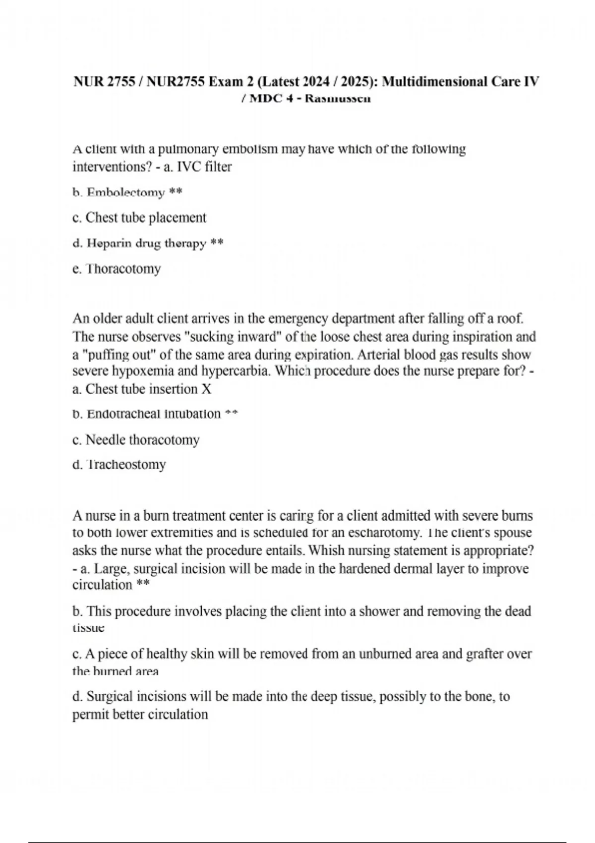A client with a pulmonary embolism may have which of the following interventions? - a. IVC filter b. Embolectomy ** c. Chest tube placement d. Heparin drug therapy ** e. Thoracotomy An older adult client arrives in the emergency department after falling off a roof. The nurse observes "sucking inward" of the loose chest area during inspiration and a "puffing out" of the same area during expiration. Arterial blood gas results show severe hypoxemia and hypercarbia. Which procedure does the nurse prepare for? - a. Chest tube insertion X b. Endotracheal intubation ** c. Needle thoracotomy d. Tracheostomy A nurse in a burn treatment center is caring for a client admitted with severe burns to both lower extremities and is scheduled for an escharotomy. The client's spouse asks the nurse what the procedure entails. Whish nursing statement is appropriate? - a. Large, surgical incision will be made in the hardened dermal layer to improve circulation ** b. This procedure involves placing the client into a shower and removing the dead tissue c. A piece of healthy skin will be removed from an unburned area and grafter over the burned area d. Surgical incisions will be made into the deep tissue, possibly to the bone, to permit better circulation A nurse is caring for a client who has burn injuries to his trunk. The nurse is explaining what to expect from the prescribed hydrotherapy. Which of the following statements by the client indicates an understanding of the teaching? - a. I will be on a special shower table to enhance wound inspection and debridement b. The water temperature will be hot to improve blood flow and healing X c. The nurse will use a wire brush to remove loose skin d. The nurse will use scissors to open small blisters Calculate the mean arterial pressure in mmHg for a client with a blood pressure of 84/46 mmHg. - 59 mmhg Which if the following interventions is not appropriate for a client diagnosed with a pneumothorax? - a. Apply wet to dry dressing on wound ** b. Monitor respiratory and circulatory function c. Assess for tracheal deviation d. Provide analgesics A client in the intensive care unit was recovering from moderate burns and smoke inhalation. His condition was improving, and plans were made to transfer him to a step-down unit. On the morning of the transfer, the client began to experience elevated temperatures and shortness of breath. Urine output decreased to 10ml/hr. labs were drawn and indicated elevated WBC, GFR, creatinine, and liver enzymes. The client is experiencing which medical complication? - a. Acute respiratory failure X b. Acute kidney injury c. Disseminated intravascular coagulation d. Multiple organ dysfunction syndrome ** A nurse is assessing a client who sustained superficial partial thickness and deep partial thickness burns 38 hours ago. Which finding should the nurse report to the provider? - a. Edema in the burned extremities b. Severe pain at the burn site c. Urine output of 65ml/hr over 2 hours d. ABG pH 7.31, PaCO2 37 mmHg, HCO3 31 mEq/L ** A nurse is caring for a client who has sustained burns over 37% of total body surface area. The client's voice has become hoarse, a brassy cough has developed, and the client is drooling. The nurse should identify these findings as indications that the client has which of the following? - a. Pulmonary edema b. Bacterial pneumonia c. Inhalation injury ** d. Carbon monoxide poisoning