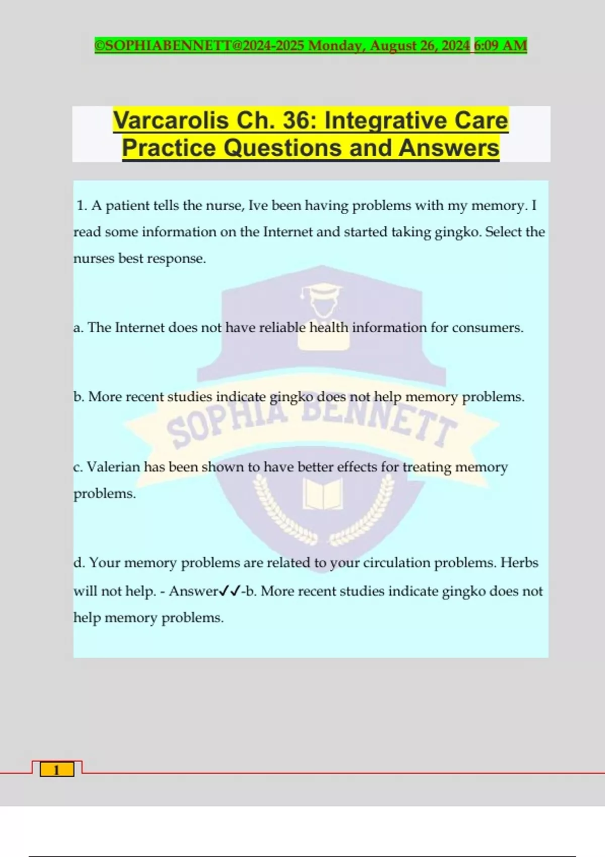 Varcarolis Ch. 36: Integrative Care Practice Questions and Answers 1. A patient tells the nurse, Ive been having problems with my memory. I read some information on the Internet and started taking gingko. Select the nurses best response. a. The Internet does not have reliable health information for consumers. b. More recent studies indicate gingko does not help memory problems. c. Valerian has been shown to have better effects for treating memory problems. d. Your memory problems are related to your circulation problems. Herbs will not help. - Answer️️ -b. More recent studies indicate gingko does not help memory problems. ©SOPHIABENNETT@ Monday, August 26, 2024 6:09 AM 2 Recent studies indicate gingko is does not help with cognition or memory problems. Valerian is useful for treating mild depression or anxiety. The other distracters are misleading. 2. A patient shows a nurse this advertisement: Our product is a scientific breakthrough helpful for depression, anxiety, and sleeplessness. Made from an ancient formula, it stimulates circulation and excretes toxins. Satisfaction guaranteed or your money back. Select the nurses best response. a. Over-the-counter products for sleep problems are ineffective. b. Do not take anything unless its prescribed by your doctor. c. Lets do some additional investigation of that product. d. It sounds like you are trying to self-medicate. - Answer️️ -c. Lets do some additional investigation of that product. Helping consumers actively evaluate the quality of information available to them is important. It is important for the nurse to work with the patient ©SOPHIABENNETT@ Monday, August 26, 2024 6:09 AM 3 and include the patients preferences regarding management of health. Advertisements indicating scientific breakthroughs or promising miracles for multiple ailments are usually for products that are useless and being fraudulently marketed. Some may even be harmful. Some over-the-counter products can be useful, and patients do not need a prescription for these products. The broader issue is safety and efficacy, rather than whether the patient is trying to self-medicate. 3. A patient wants to learn more about integrative therapies. Which resource should the nurse suggest for the most reliable information? a. Internet b. American Nurses Association (ANA) c. Food and Drug Administration (FDA) d. National Center for Complementary and Alternative Medicine (NCCAM) - Answer️️ -d. National Center for Complementary and Alternative Medicine (NCCAM) ©SOPHIABENNETT@ Monday, August 26, 2024 6:09 AM 4 The National Center for Complementary and Alternative Medicine has a clearinghouse from which individuals may request information. The FDA has information, but it is not as extensive as NCCAM. The Internet has many resources but some are unreliable. The ANA does not provide extensive information about this topic. 4. A patient with a history of asthma says, Ive been very nervous lately. I think aromatherapy will help. I am ordering $250 worth of oils from an Internet site that promised swift results. Select the nurses best action. a. Support the patients efforts to become informed and to find health solutions. b. Suggest the patient check with friends who have tried aromatherapy for treatment of anxiety. c. Remind the patient, If you spend that much on oils, you may not be able to buy your prescribed medication. d. Tell the patient, Aromatherapy can complicate respiratory problems such as asthma. Lets consider some other options. - Answer️️ -d. Tell the ©SOPHIABENNETT@ Monday, August 26, 2024 6:09 AM 5 patient, Aromatherapy can complicate respiratory problems such as asthma. Lets consider some other options. Safety is paramount, and aromatherapy may cause complications for a patient with asthma. The nurse should view alternative treatments with an open mind and try to recognize the importance of the treatment to the patient while trying to give the patient accurate, reliable information about the treatment. Although efforts to become health literate should be supported, educating the patient about the pitfalls of relying on the Internet is essential. The opinions of others, whether they are positive or negative, lack a scientific basis and are subject to confounding variables such as the placebo effect and individual factors such as age and health history. Admonishing the patient may jeopardize the relationship. 5. A patient says, I have taken megadoses of vitamin E for 3 months to improve my circulation, but I think I feel worse. Which action should the nurse take first? a. Explain to the patient that megadoses may be harmful and advise caution. ©SOPHIABENNETT@ Monday, August 26, 2024 6:09 AM 6 b. Assess the patient for symptoms and signs of toxicity from excess vitamin exposure. c. Assess for signs of circulatory integrity to determine whether improvement has occurred. d. Educate the patient that research has not shown that megadoses of vitamins produce benefits. - Answer️️ -b. Assess the patient for symptoms and signs of toxicity from excess vitamin exposure. Megadoses of many vitamins, especially when taken over long periods, may produce dangerous side effects or toxicity. The priority for the nurse is to assess for signs of any dangerous consequences of the patients use of such a regimen. Secondary interventions would include patient education about research findings related to the practice, along with any benefits and undesired effects associated with the practice. A health care provider should also assess the patient for cardiovascular concerns. 6. Acupuncture is a traditional Chinese medical treatment based on the belief that: a. insertion of needles in key locations will drain toxic energies. ©SOPHIABENNETT@ Monday, August 26, 2024 6:09 AM 7 b. pressure on meridian points will correct problems in energy flow. c. insertion of needles modulates the flow of energy along body meridians. d. taking small doses of noxious substances will alleviate spe