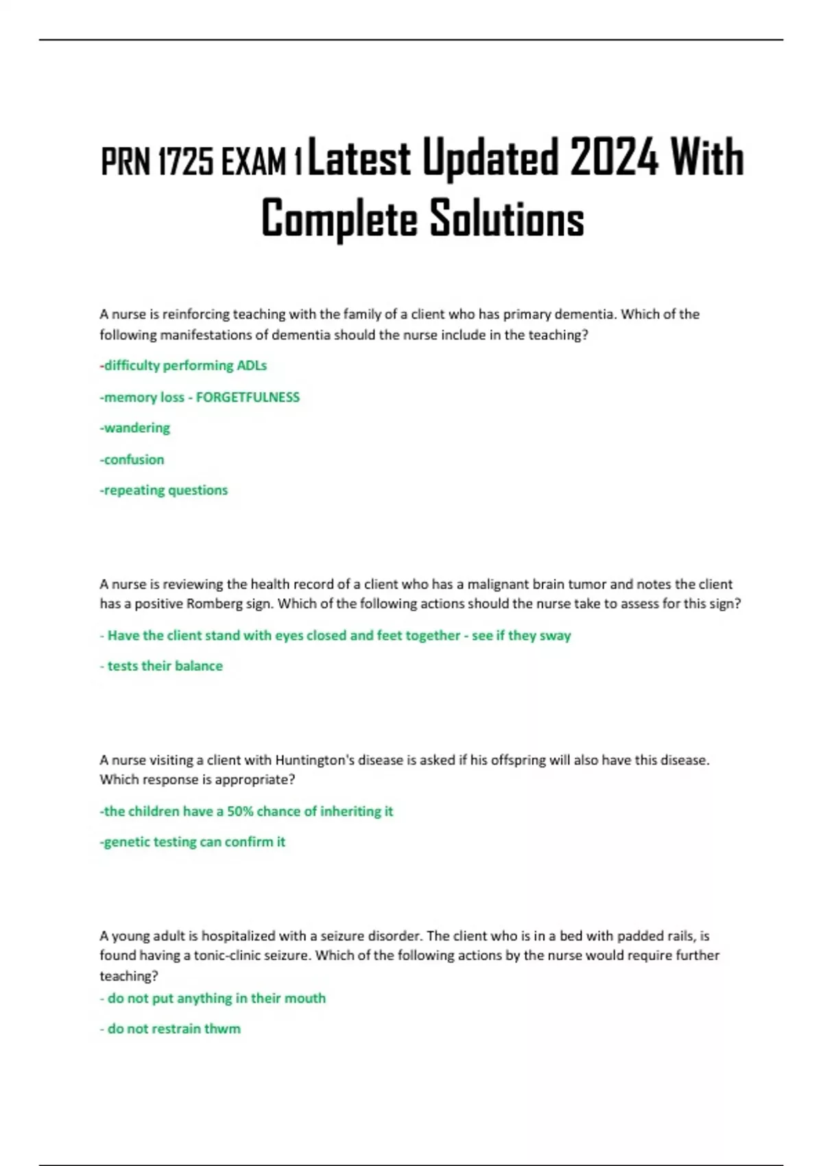 PRN 1725 EXAM 1 Latest Updated 2024 With Complete Solutions A nurse is reinforcing teaching with the family of a client who has primary dementia. Which of the following manifestations of dementia should the nurse include in the teaching? -difficulty performing ADLs -memory loss - FORGETFULNESS -wandering -confusion -repeating questions A nurse is reviewing the health record of a client who has a malignant brain tumor and notes the client has a positive Romberg sign. Which of the following actions should the nurse take to assess for this sign? - Have the client stand with eyes closed and feet together - see if they sway - tests their balance A nurse visiting a client with Huntington's disease is asked if his offspring will also have this disease. Which response is appropriate? -the children have a 50% chance of inheriting it -genetic testing can confirm it A young adult is hospitalized with a seizure disorder. The client who is in a bed with padded rails, is found having a tonic-clinic seizure. Which of the following actions by the nurse would require further teaching? - do not put anything in their mouth - do not restrain thwm A nurse is caring for a client who just experienced a generalized seizure. Which of the following actions should the nurse perform first? -make sure they are safe -LOC -stay with the person -DO NOT move them A nurse is caring for a client who sustained a head injury in an accident. A focused exam reveals that one pupil is larger than the other. What should the nurse do first? -notify the provider Which nursing intervention is the priority when caring for a client during the acute phase of Guillain- Barre? -assessment is the most important part during the acute stage -monitor the progression of paralysis -monitor ABGs -orthostatic hypertension and cardiac dysrhythmia A nurse is collecting data from an infant who hit her head when she fell off a dressing table. the nurse should identify which of the following as indicating increased intracranial pressure? -high pitched cry -irritability -bulging fontanels -setting sun (eyes looking down)