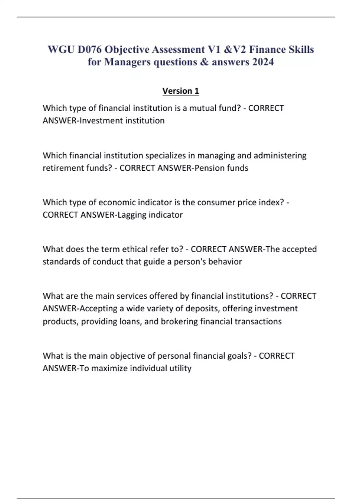 WGU D076 Objective Assessment V1 &V2 Finance Skills