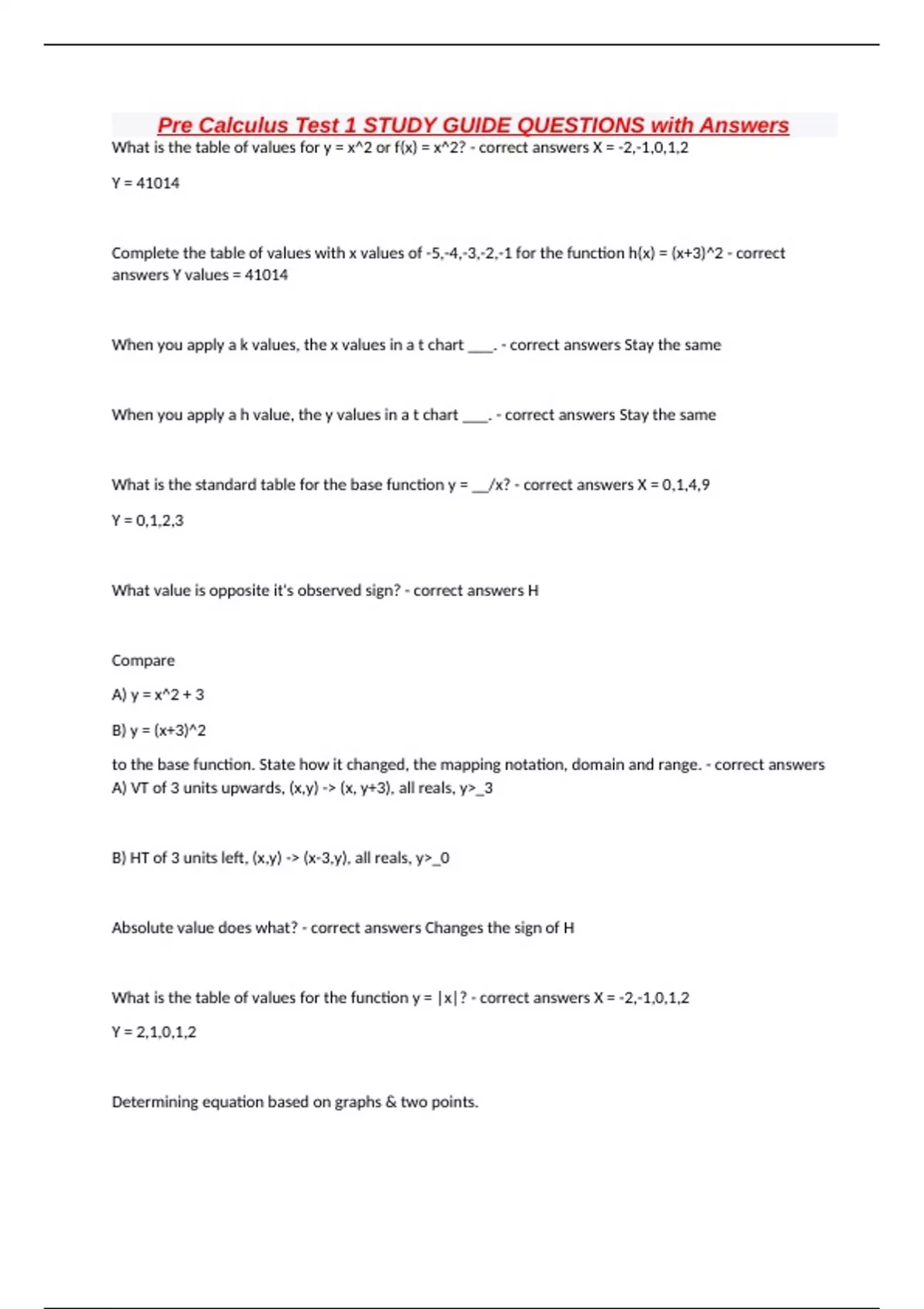 Pre Calculus Test 1 STUDY GUIDE QUESTIONS with Answers What is the table of values for y = x^2 or f(x) = x^2? - correct answers X = -2,-1,0,1,2 Y = 41014 Complete the table of values with x values of -5,-4,-3,-2,-1 for the function h(x) = (x+3)^2 - correct answers Y values = 41014 When you apply a k values, the x values in a t chart ___. - correct answers Stay the same When you apply a h value, the y values in a t chart ___. - correct answers Stay the same What is the standard table for the base function y = __/x? - correct answers X = 0,1,4,9 Y = 0,1,2,3 What value is opposite it's observed sign? - correct answers H Compare A) y = x^2 + 3 B) y = (x+3)^2 to the base function. State how it changed, the mapping notation, domain and range. - correct answers A) VT of 3 units upwards, (x,y) -> (x, y+3), all reals, y>_3 B) HT of 3 units left, (x,y) -> (x-3,y), all reals, y>_0 Absolute value does what? - correct answers Changes the sign of H What is the table of values for the function y = |x|? - correct answers X = -2,-1,0,1,2 Y = 2,1,0,1,2 Determining equation based on graphs & two points.
