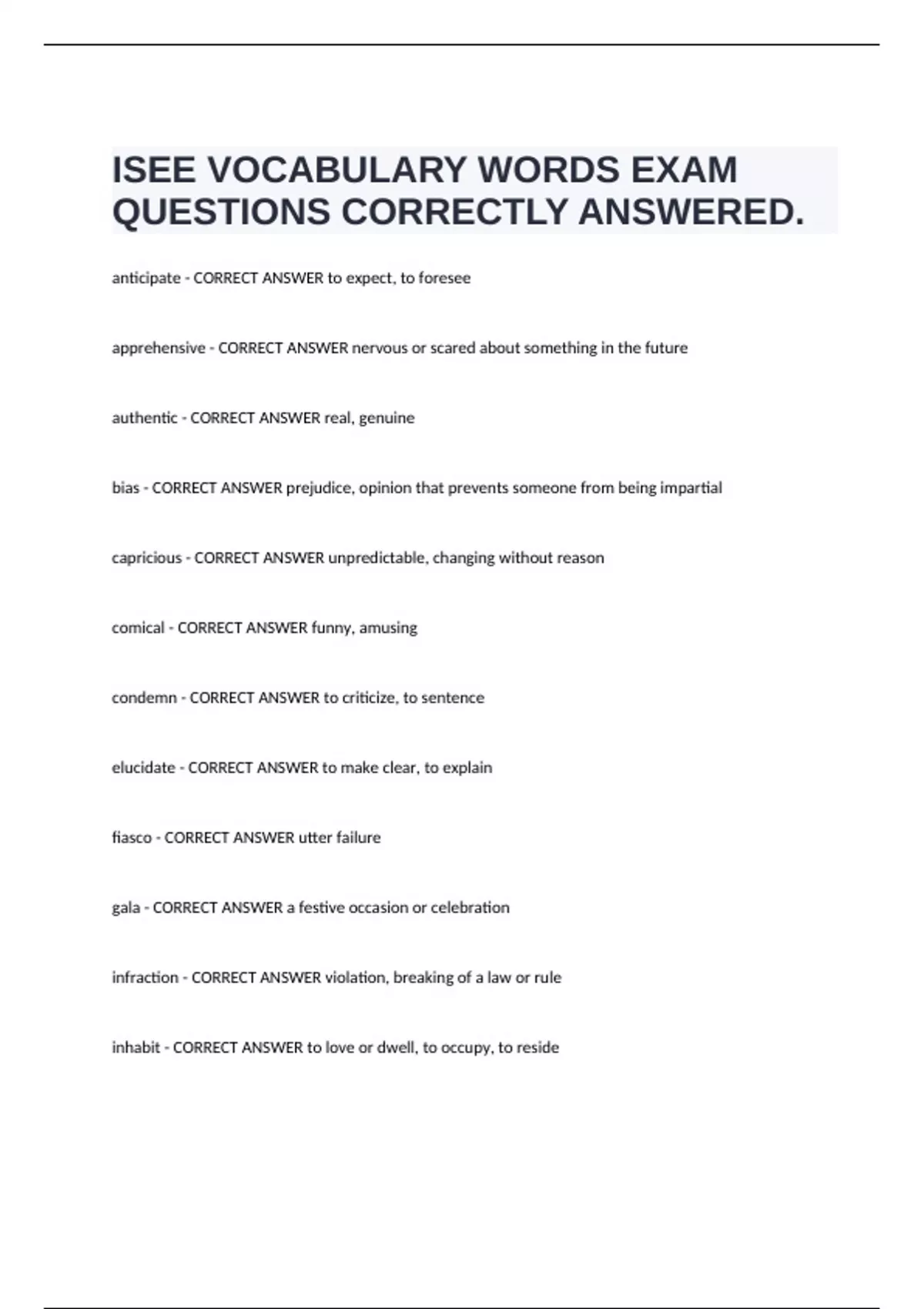 ISEE VOCABULARY WORDS EXAM QUESTIONS CORRECTLY ANSWERED. anticipate - CORRECT ANSWER to expect, to foresee apprehensive - CORRECT ANSWER nervous or scared about something in the future authentic - CORRECT ANSWER real, genuine bias - CORRECT ANSWER prejudice, opinion that prevents someone from being impartial capricious - CORRECT ANSWER unpredictable, changing without reason comical - CORRECT ANSWER funny, amusing condemn - CORRECT ANSWER to criticize, to sentence elucidate - CORRECT ANSWER to make clear, to explain fiasco - CORRECT ANSWER utter failure gala - CORRECT ANSWER a festive occasion or celebration infraction - CORRECT ANSWER violation, breaking of a law or rule inhabit - CORRECT ANSWER to love or dwell, to occupy, to reside peer - CORRECT ANSWER to look intently or with difficulty placate - CORRECT ANSWER to soothe, to satisfy, to appease reliable - CORRECT ANSWER trustworthy, dependable resemble - CORRECT ANSWER to look like or be similar to revere - CORRECT ANSWER to honor, to worship static - CORRECT ANSWER unchanging, not moving tact - CORRECT ANSWER the ability to say the right thing at the right time