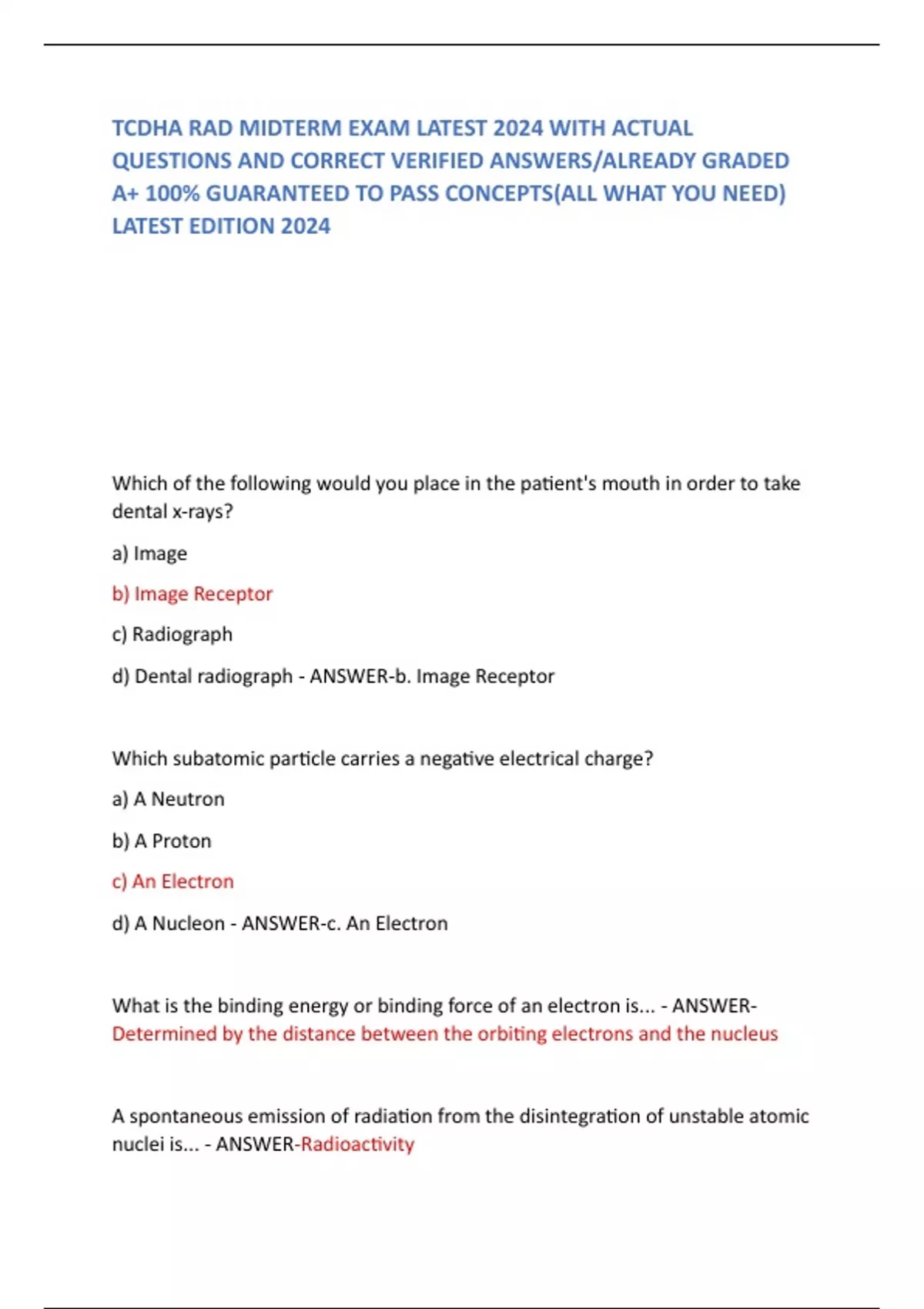 TCDHA RAD MIDTERM EXAM LATEST 2024 WITH ACTUAL QUESTIONS AND CORRECT VERIFIED ANSWERS/ALREADY GRADED A+ 100% GUARANTEED TO PASS CONCEPTS(ALL WHAT YOU NEED) LATEST EDITION 2024