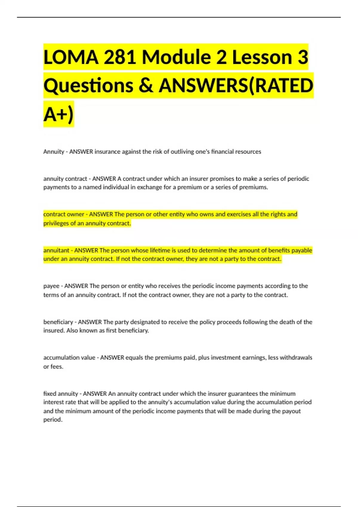 LOMA 281 Module 2 Lesson 3 Questions & ANSWERS(RATED A+)