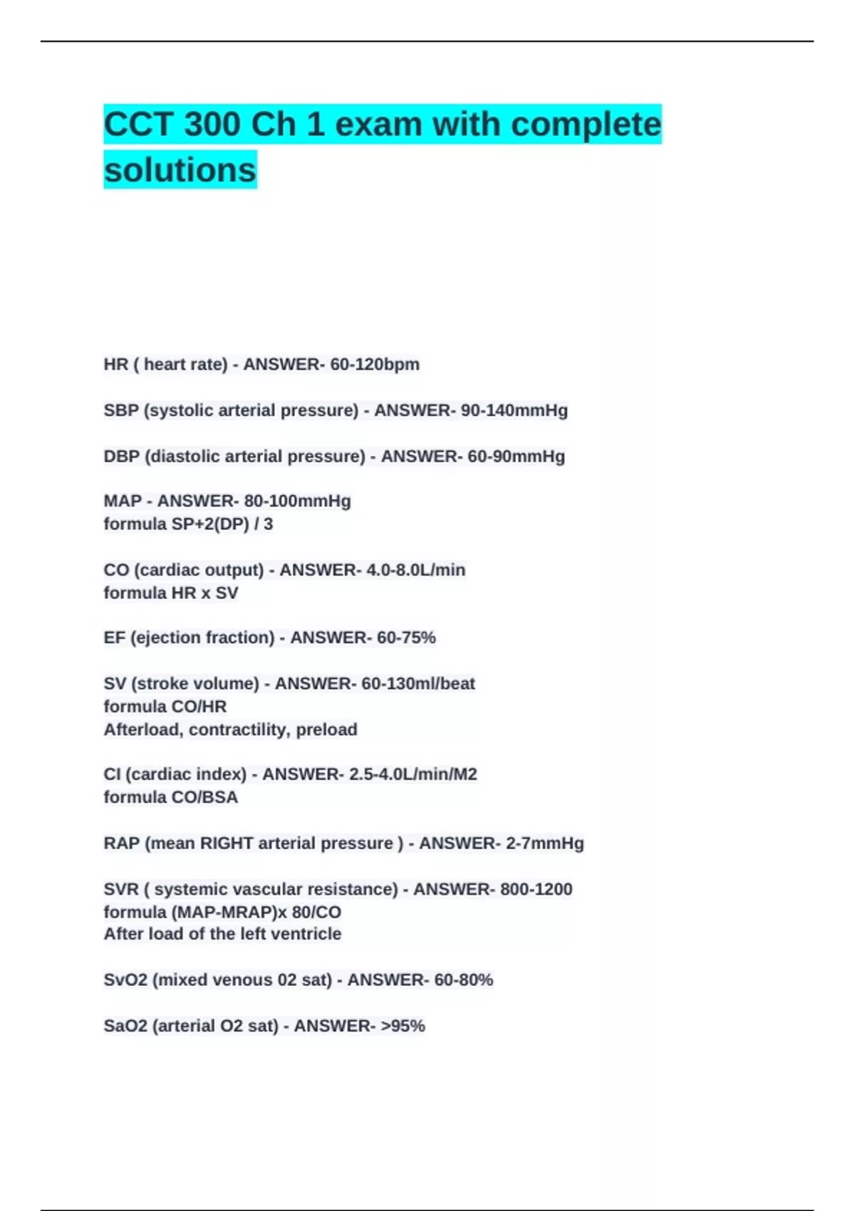 SVR ( systemic vascular resistance) - ANSWER- 800-1200