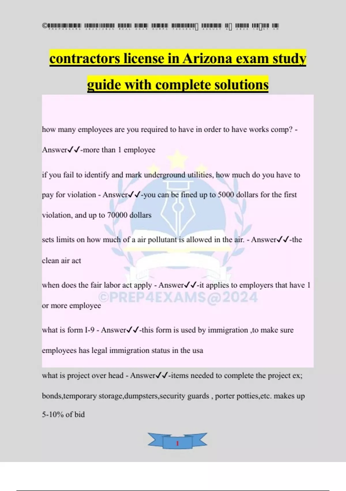 contractors license in Arizona exam study guide with complete solutions how many employees are you required to have in order to have works comp? - Answer️️ -more than 1 employee if you fail to identify and mark underground utilities, how much do you have to pay for violation - Answer️️ -you can be fined up to 5000 dollars for the first violation, and up to 70000 dollars sets limits on how much of a air pollutant is allowed in the air. - Answer️️ -the clean air act when does the fair labor act apply - Answer️️ -it applies to employers that have 1 or more employee what is form I-9 - Answer️️ -this form is used by immigration ,to make sure employees has legal immigration status in the usa what is project over head - Answer️️ -items needed to complete the project ex; bonds,temporary storage,dumpsters,security guards , porter potties,etc. makes up 5-10% of bid ©PREP4EXAMS 2024/2025 REAL EXAM DUMPS Tuesday, August 6, 2024 10,57 AM 2 what is the clean water act - Answer️️ -establishes the basic structure for regulating disharges of pollutants into the waters of united states what are current liabilities - Answer️️ -liabilities that will mature and must be paid within 1 year immigration forms must be kept for how long - Answer️️ -at least 3 years what is a maintance bond - Answer️️ -guarantees that for one year no defective workmanship or material will appear on completed project liability insurance is what - Answer️️ -to protect 3rd party claims keyman life insurance - Answer️️ -its to continue business if one dies or becomes incapacitated how much money is deducted from employee to pay for works comp - Answer️️ - nothing. employer pays for everything how soon must form I-9 be completed by - Answer️️ -it should be completed within 3 days of hire how long should you keep lead pamphlet receipt for - Answer️️ -must be kept for 3 years ©PREP4EXAMS 2024/2025 REAL EXAM DUMPS Tuesday, August 6, 2024 10,57 AM 3 bonds or cash deposits should be under whos name - Answer️️ -the licensee how soon should you do a publication - Answer️️ -you must publish within 60 days for 3 consecutives publications who certifies when a project is complete and the work meets conditions of the contract documents - Answer️️ -the architect or the engineer what are progress payments - Answer️️ -are partial payments made after specified phases of construction are complete what is the single prime method - Answer️️ -its when a project owner hires an architectural firm to design the project the contractor then perfume the work what is a payment bond - Answer️️ -guarantees that subcontractors and suppliers will be paid for work if they perform properly under the contract a corporate name may be reserved with the corporation commission for how many days - Answer️️ -120 days prior to incorporation how long should employees keep tax records for? - Answer️️ -at least 4 years what is all risk builders insurance - Answer️️ -it covers property owners n builders for buildings under construction. typically covers machinery equipment , materials supplies and fixtures ©PREP4EXAMS 2024/2025 REAL EXAM DUMPS Tuesday, August 6, 2024 10,57 AM 4 what is property insurance - Answer️️ -typically it covers your business n personal property when damaged theft or loss.. what is works comp - Answer️️ -it protects employees wh