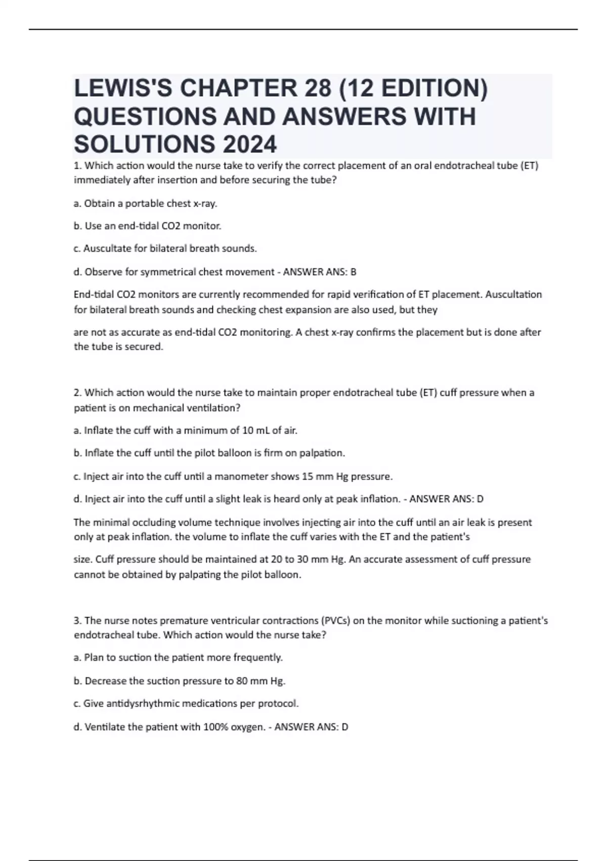 d. Inject air into the cuff until a slight leak is heard only at peak inflation. - ANSWER ANS: D