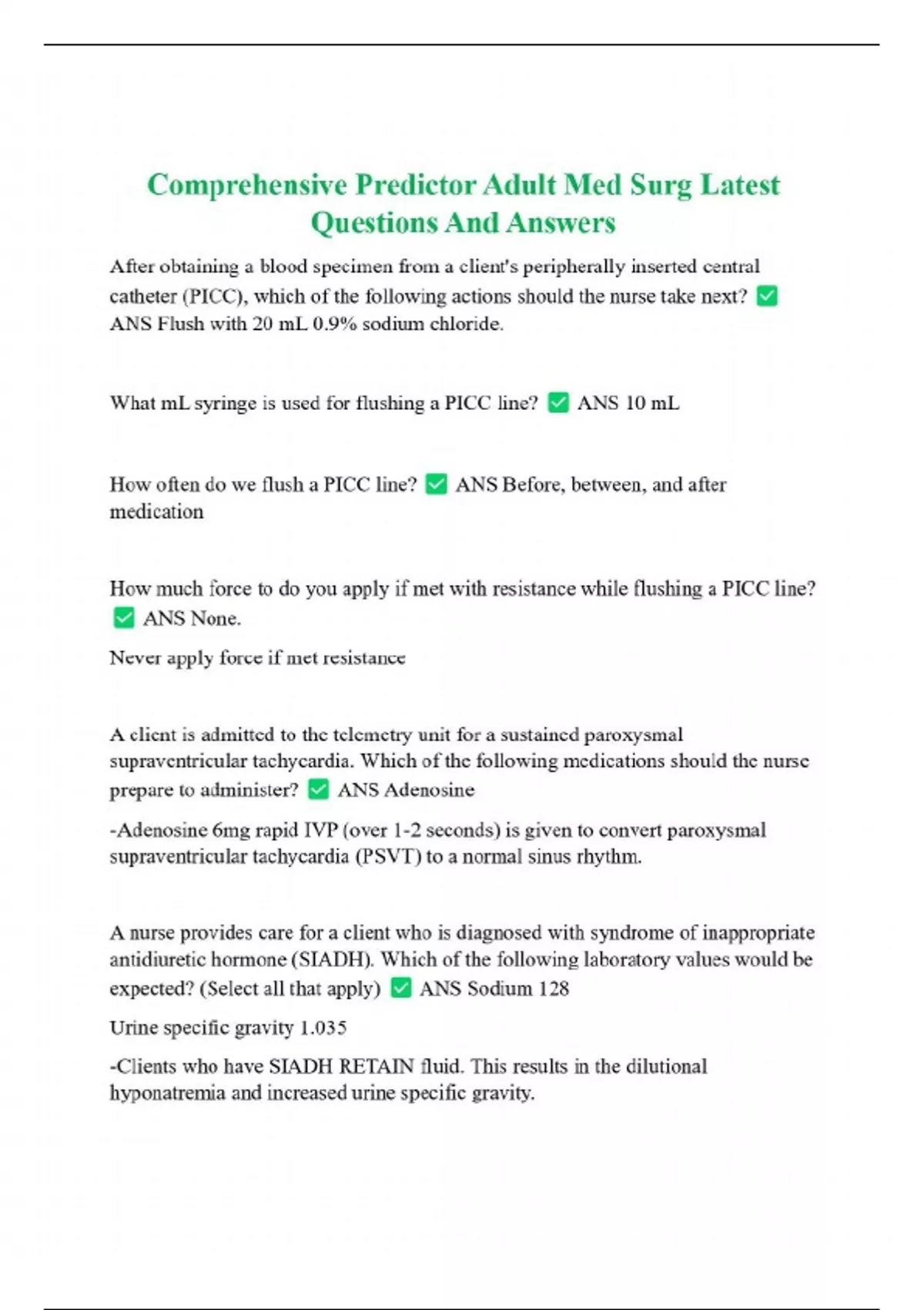 Comprehensive Predictor Adult Med Surg Latest Questions And Answers After obtaining a blood specimen from a client's peripherally inserted central catheter (PICC), which of the following actions should the nurse take next? ANS Flush with 20 mL 0.9% sodium chloride. What mL syringe is used for flushing a PICC line? ANS 10 mL How often do we flush a PICC line? ANS Before, between, and after medication How much force to do you apply if met with resistance while flushing a PICC line? ANS None. Never apply force if met resistance