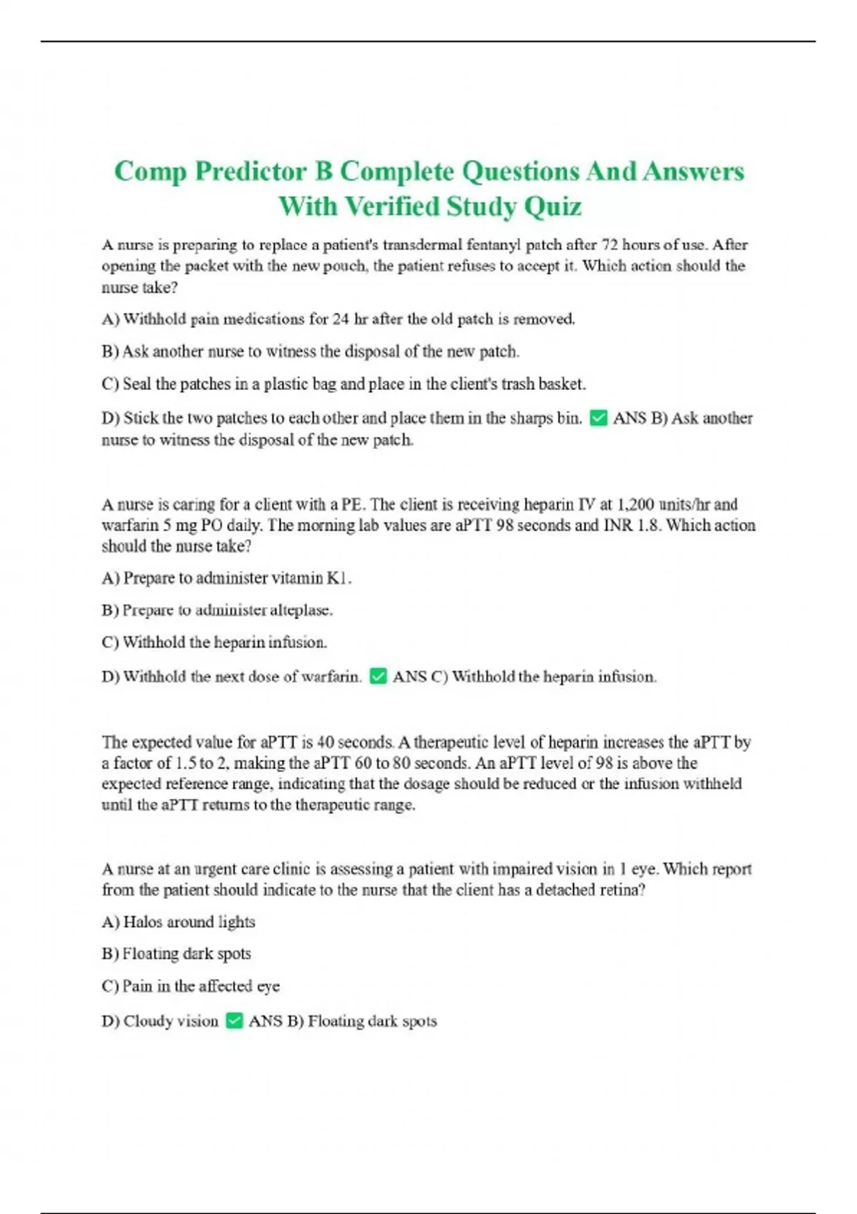 Comp Predictor B Complete Questions And Answers With Verified Study Quiz A nurse is preparing to replace a patient's transdermal fentanyl patch after 72 hours of use. After opening the packet with the new pouch, the patient refuses to accept it. Which action should the nurse take? A) Withhold pain medications for 24 hr after the old patch is removed. B) Ask another nurse to witness the disposal of the new patch. C) Seal the patches in a plastic bag and place in the client's trash basket. D) Stick the two patches to each other and place them in the sharps bin. ANS B) Ask another nurse to witness the disposal of the new patch. A nurse is caring for a client with a PE. The client is receiving heparin IV at 1,200 units/hr and warfarin 5 mg PO daily. The morning lab values are aPTT 98 seconds and INR 1.8. Which action should the nurse take? A) Prepare to administer vitamin K1. B) Prepare to administer alteplase. C) Withhold the heparin infusion. D) Withhold the next dose of warfarin. ANS C) Withhold the heparin infusion.