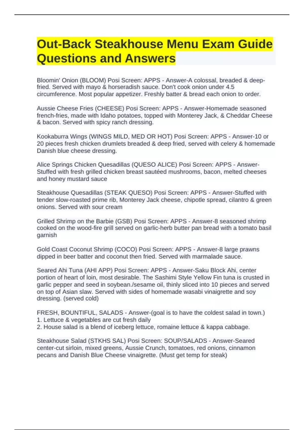 Out-Back Steakhouse Menu Exam Guide Questions and Answers