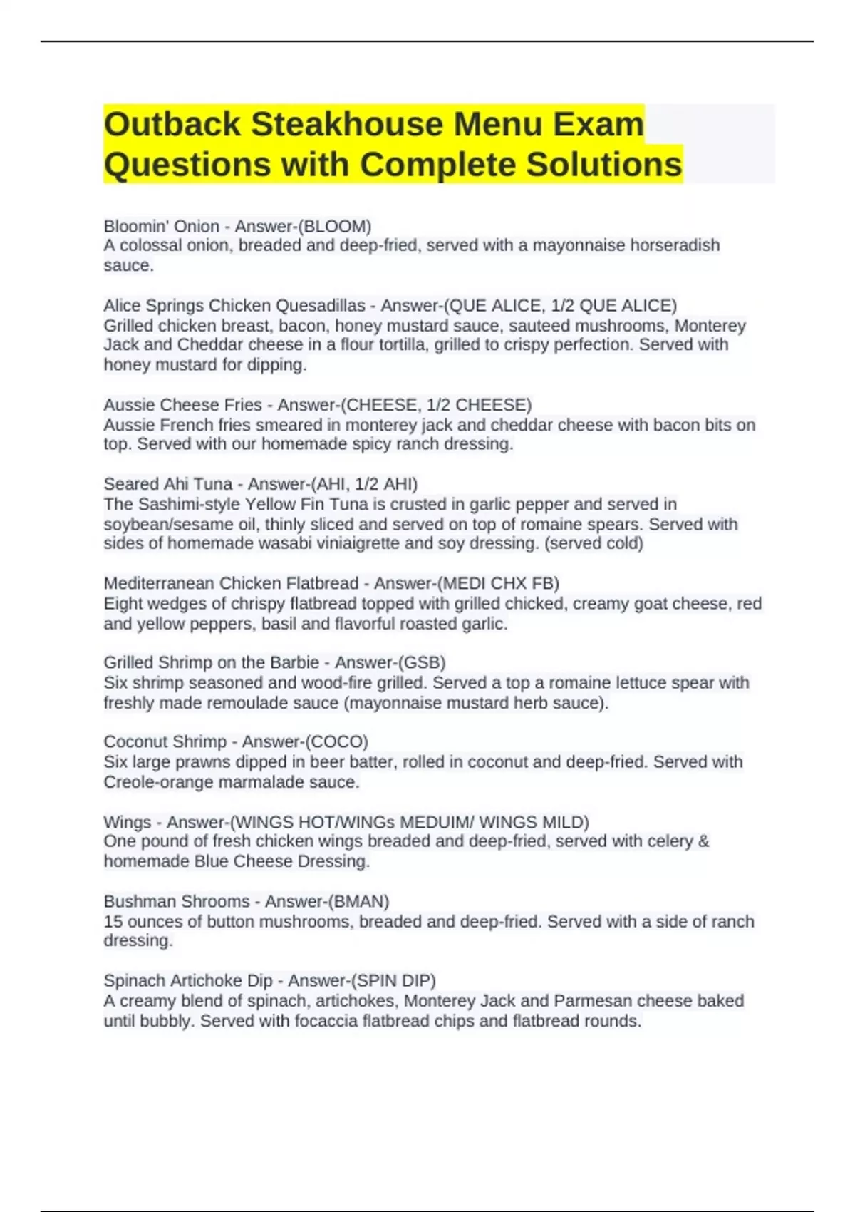 Outback Steakhouse Menu Exam Questions with Complete Solutions