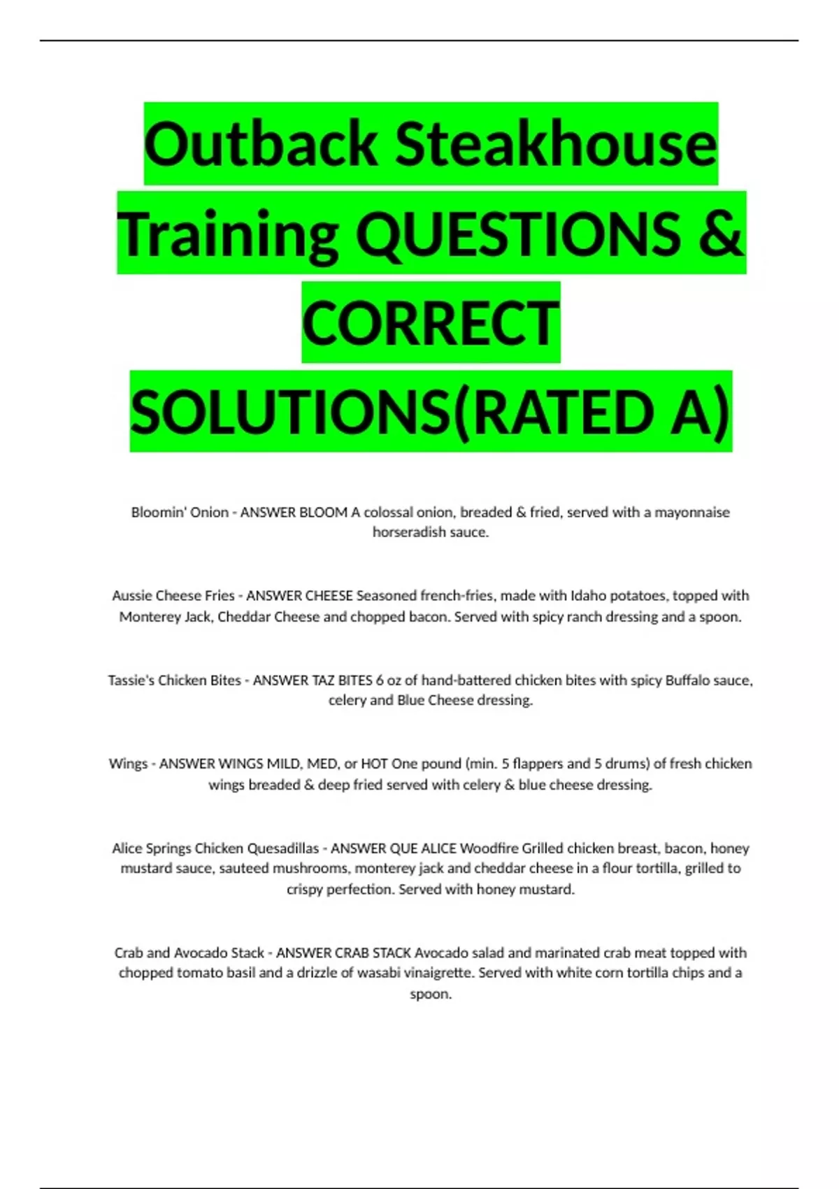 Outback Steakhouse Training QUESTIONS & CORRECT SOLUTIONS(RATED A)
