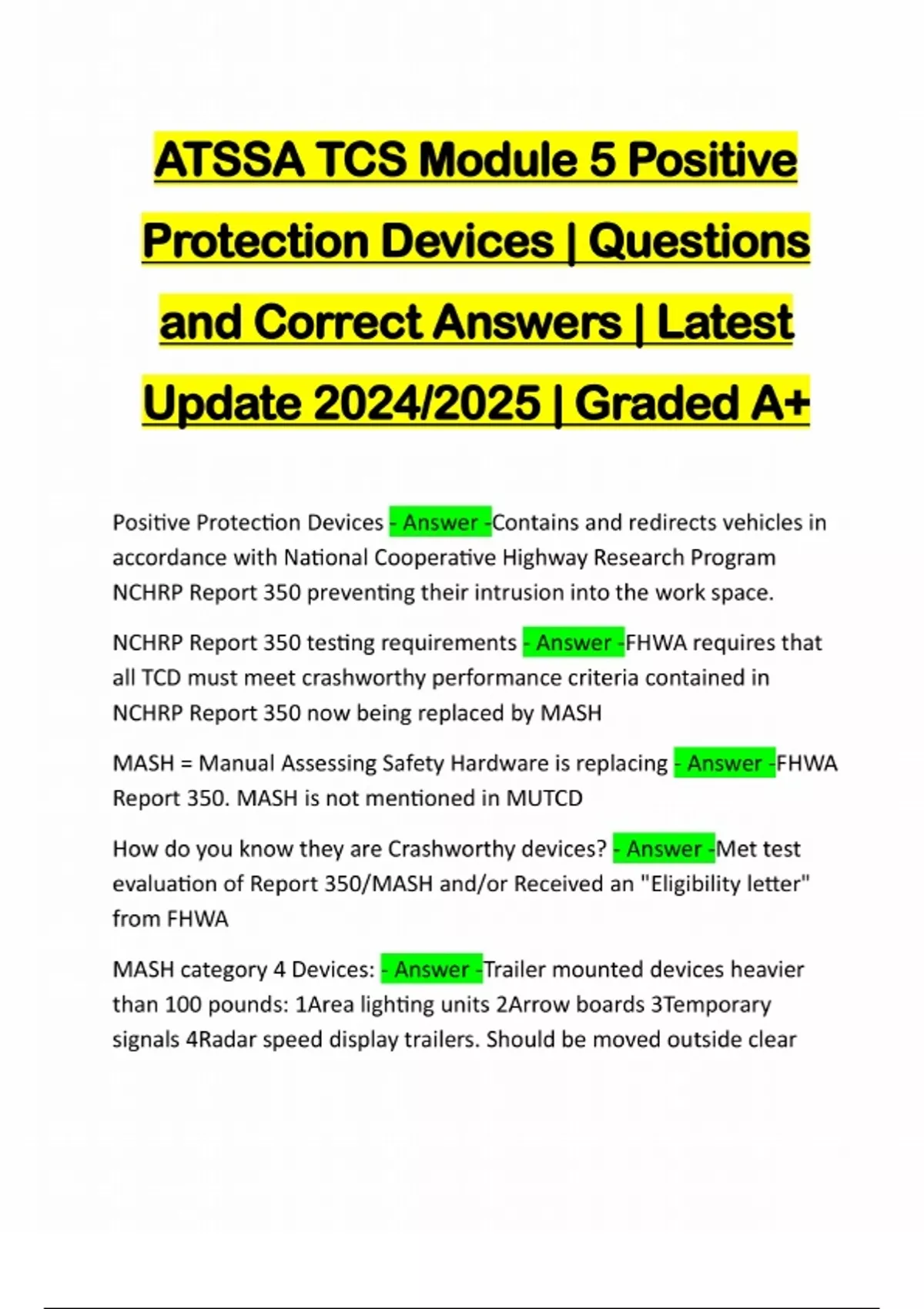 ATSSA TCS Module 5 Positive Protection Devices | Questions and Correct Answers | Latest Update 2024/2025 | Graded A+ Positive Protection Devices - Answer -Contains and redirects vehicles in accordance with National Cooperative Highway Research Program NCHRP Report 350 preventing their intrusion into the work space. NCHRP Report 350 testing requirements - Answer -FHWA requires that all TCD must meet crashworthy performance criteria contained in NCHRP Report 350 now being replaced by MASH MASH = Manual Assessing Safety Hardware is replacing - Answer -FHWA Report 350. MASH is not mentioned in MUTCD How do you know they are Crashworthy devices? - Answer -Met test evaluation of Report 350/MASH and/or Received an "Eligibility letter" from FHWA MASH category 4 Devices: - Answer -Trailer mounted devices heavier than 100 pounds: 1Area lighting units 2Arrow boards 3Tempo