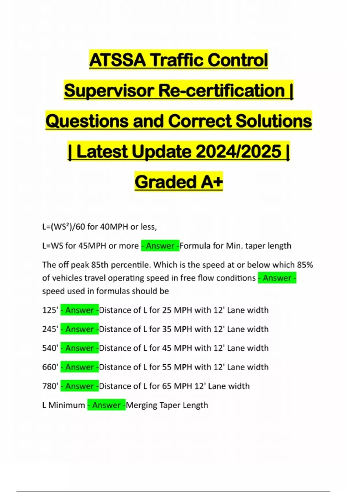 ATSSA Traffic Control Supervisor Re-certification | Questions and Correct Solutions | Latest Update 2024/2025 | Graded A+ L=(WS²)/60 for 40MPH or less, L=WS for 45MPH or more - Answer -Formula for Min. taper length The off peak 85th percentile. Which is the speed at or below which 85% of vehicles travel operating speed in free flow conditions - Answer - speed used in formulas should be 125' - Answer -Distance of L for 25 MPH with 12' Lane width 245' - Answer -Distance of L for 35 MPH with 12' Lane width 540' - Answer -Distance of L for 45 MPH with 12' Lane width 660' - Answer -Distance of L for 55 MPH with 12' Lane width 780' - Answer -Distance of L for 65 MPH 12' Lane width L Minimum - Answer -Merging Taper Length1/2 L Minimum - Answer -Shifting Taper Length 1/3 L Minimum - Answer -Shoulder Taper Length 50'-100' regardless of speed 6 devices 10'-20' apart - Answer -One-Lane, Two-Way Taper (Flagger taper) Length and number of devices 50'-100' per lane - Answer -Downstream taper Lengt
