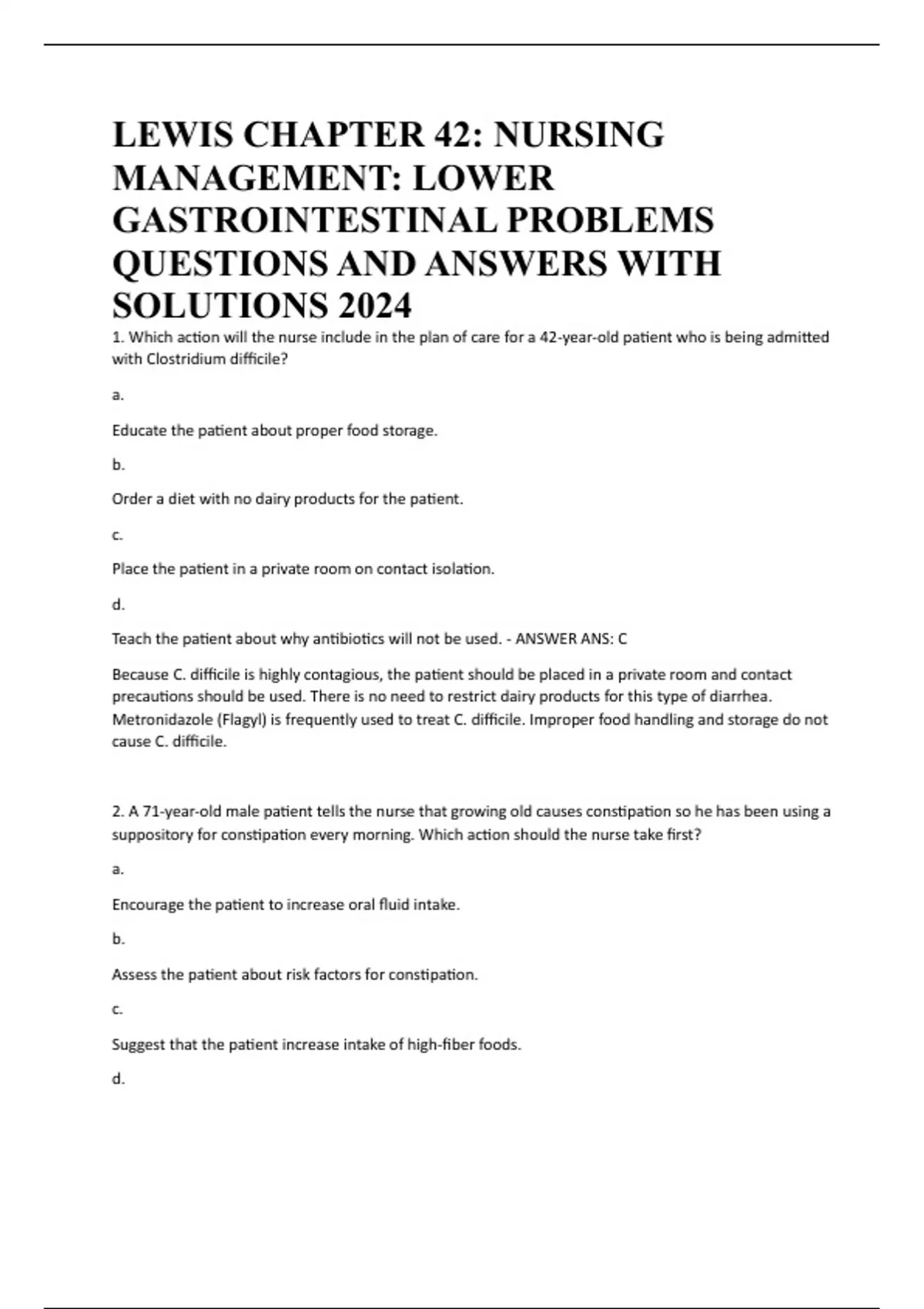 Because C. difficile is highly contagious, the patient should be placed in a private room and contact