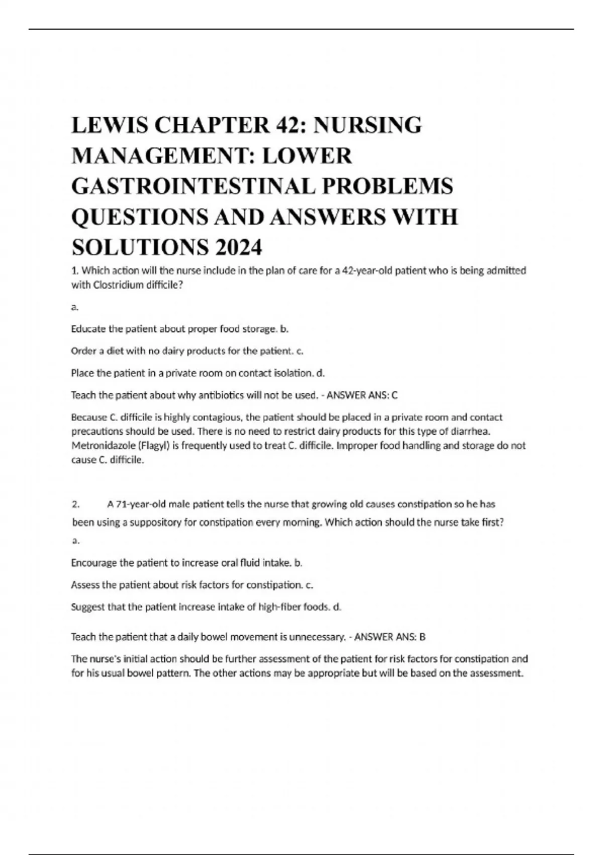 LEWIS CHAPTER 42: NURSING MANAGEMENT: LOWER GASTROINTESTINAL PROBLEMS QUESTIONS AND ANSWERS WITH SOLUTIONS 2024