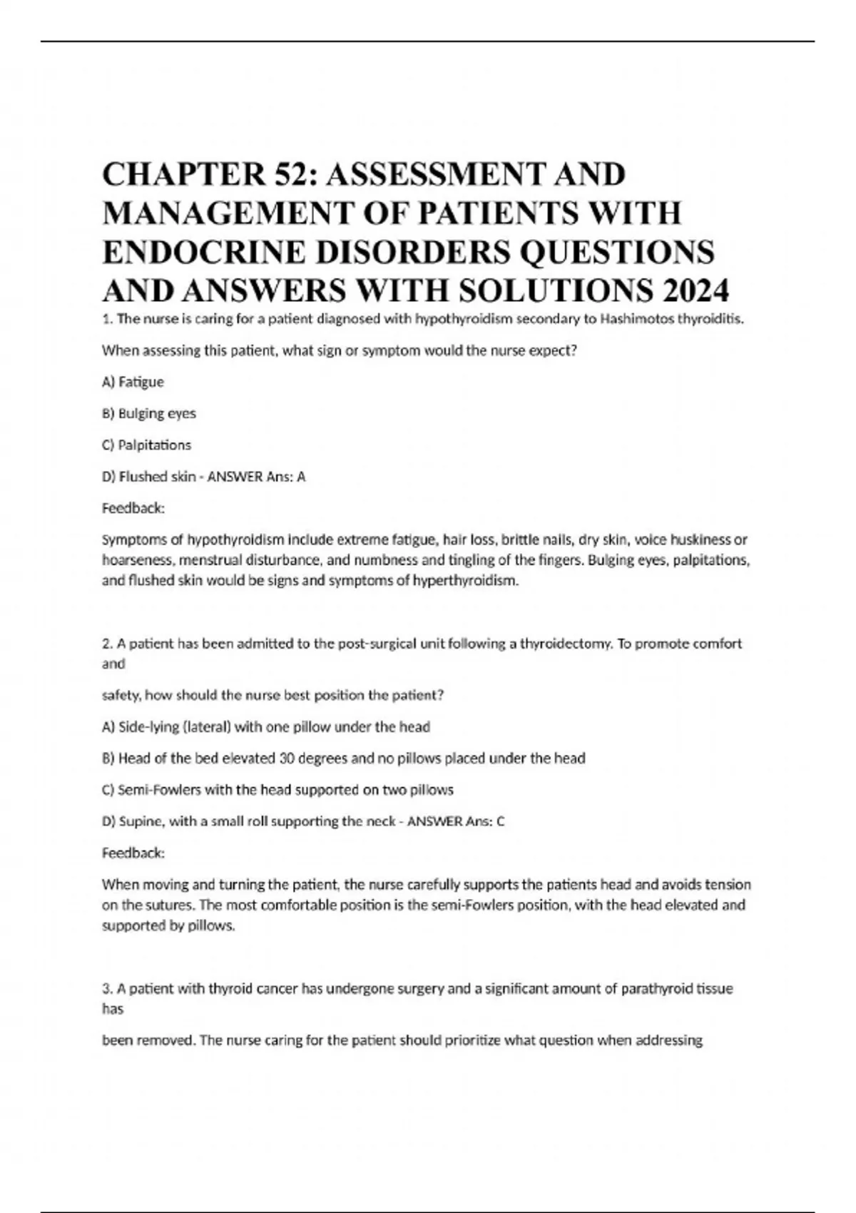 CHAPTER 52: ASSESSMENT AND MANAGEMENT OF PATIENTS WITH ENDOCRINE DISORDERS QUESTIONS AND ANSWERS WITH SOLUTIONS 2024