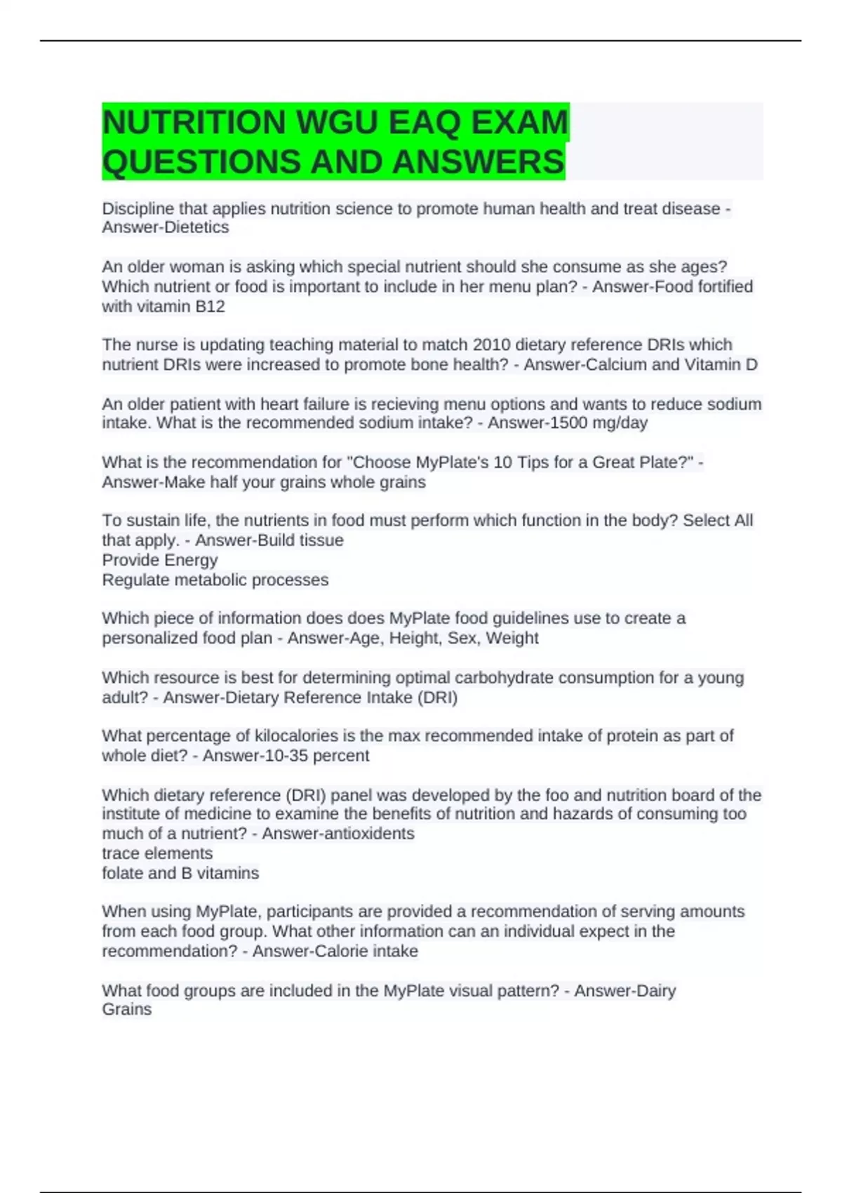 NUTRITION WGU EAQ EXAM QUESTIONS AND ANSWERS