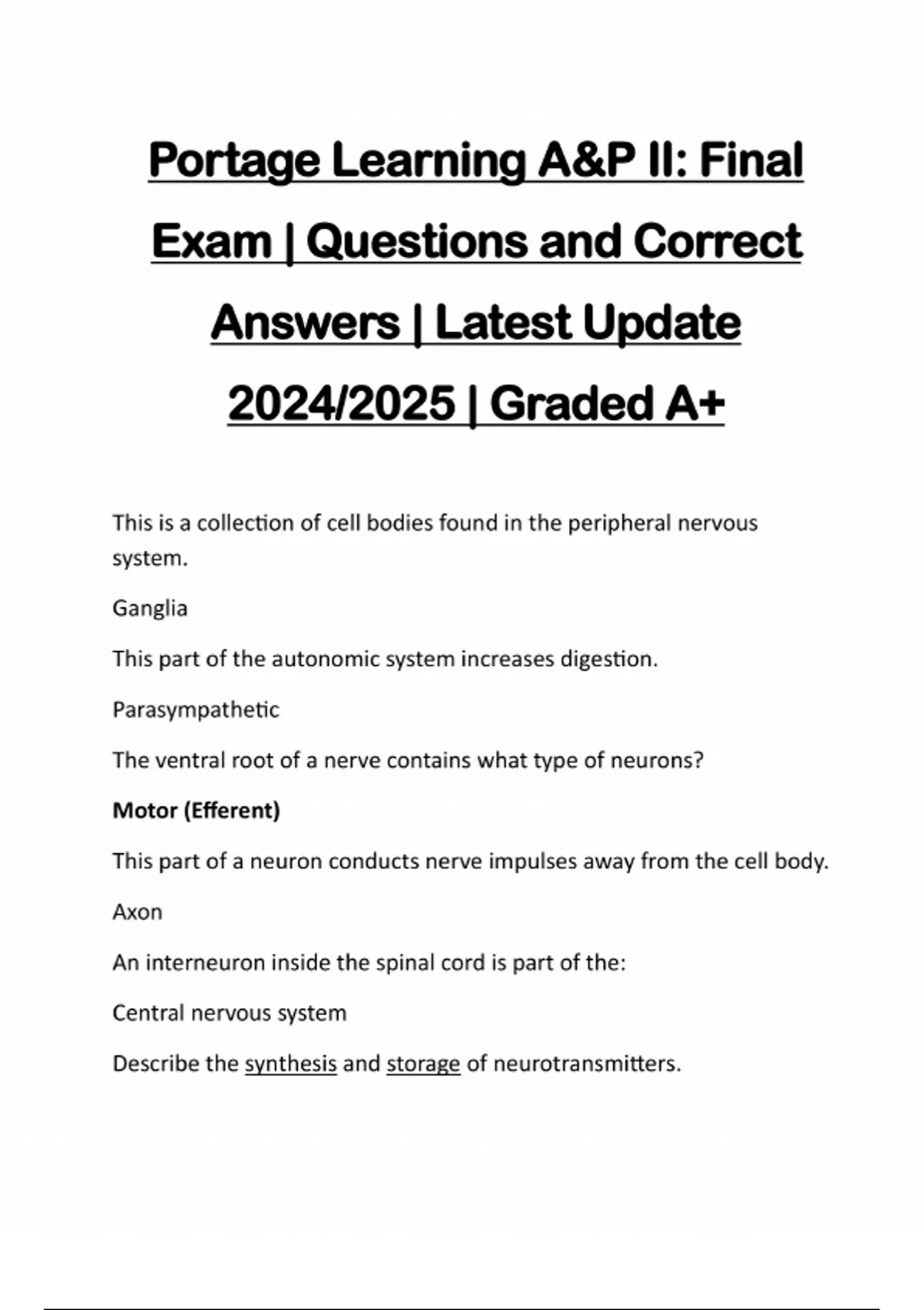Portage Learning A&P II: Final Exam | Questions and Correct Answers | Latest Update 2024/2025 | Graded A+