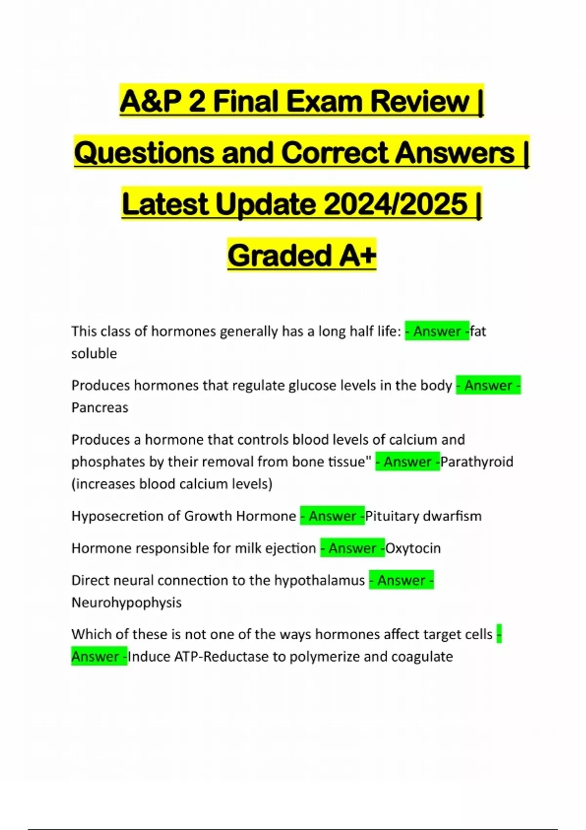 A&P 2 Final Exam Review | Questions and Correct Answers | Latest Update 2024/2025 | Graded A+ This class of hormones generally has a long half life: - Answer -fat soluble Produces hormones that regulate glucose levels in the body - Answer - Pancreas Produces a hormone that controls blood levels of calcium and phosphates by their removal from bone tissue" - Answer -Parathyroid (increases blood calcium levels) Hyposecretion of Growth Hormone - Answer -Pituitary dwarfism Hormone responsible for milk ejection - Answer -Oxytocin Direct neural connection to the hypothalamus - Answer - Neurohypophysis Which of these is not one of the ways hormones affect target cells - Answer -Induce ATP-Reductase to polymerize and coagulateSynthesis of glucose from noncarbohydrate molecules is called - Answer -gluconeogenesis The most potent mineralocorticoid and accounts for 95% of the mineralocorticoids produced - Answer -Aldosterone The name of the system that connects the hypothalamus with the anterior pituitary gland is: - Answer -Hypothalamic portal system Falling levels of potassium and ri