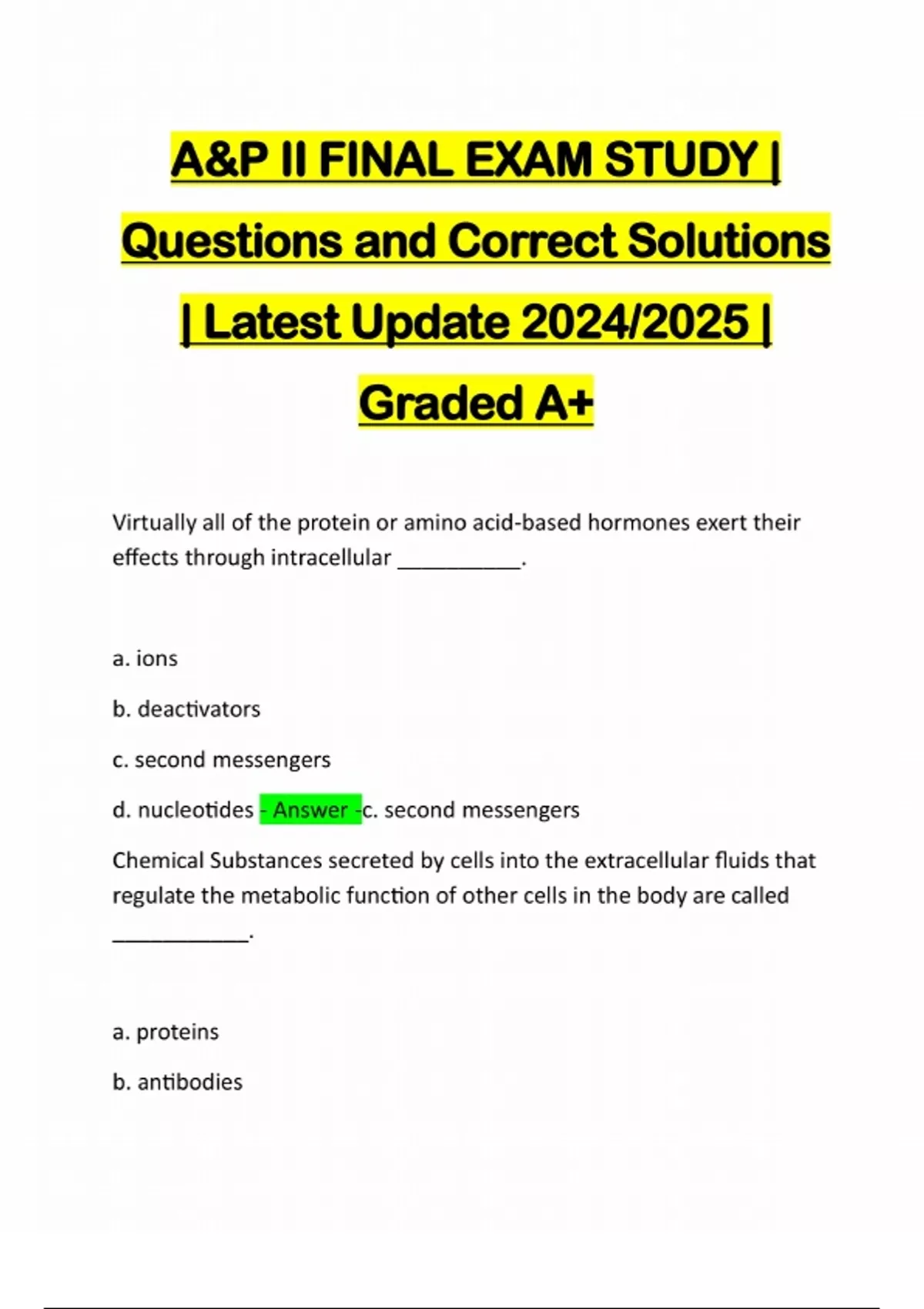 A&P II FINAL EXAM STUDY | Questions and Correct Solutions | Latest Update 2024/2025 | Graded A+ Virtually all of the protein or amino acid-based hormones exert their effects through intracellular __________. a. ions b. deactivators c. second messengers d. nucleotides - Answer -c. second messengers Chemical Substances secreted by cells into the extracellular fluids that regulate the metabolic function of other cells in the body are called ___________. a. proteins b. antibodiesc. hormones d. enzymes - Answer -c. hormones The master gland of the endocrine system is the_________. a. endocrine b. pituitary c. adrenal d. thyroid - Answer -b. pitui