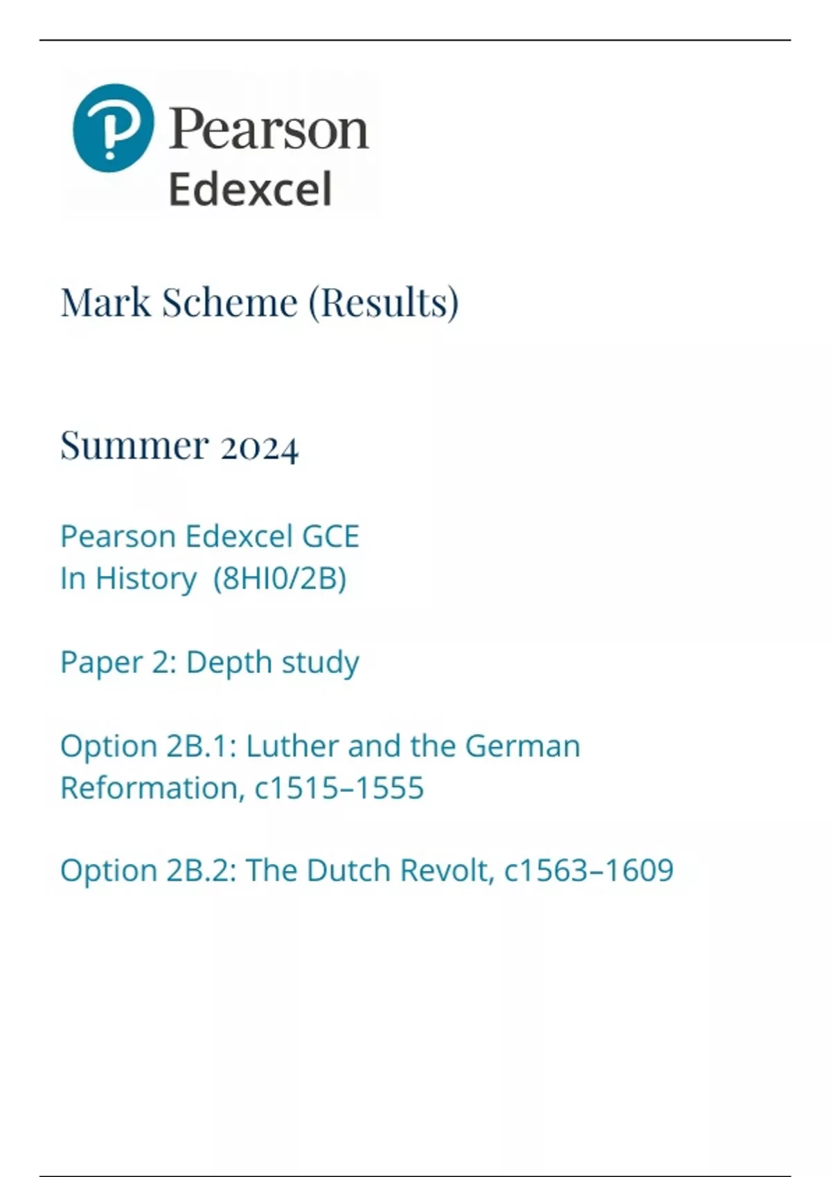 Mark Scheme (Results) Summer 2024 Pearson Edexcel GCE In History (8HI0/2B) Paper 2: Depth study Option 2B.1: Luther and the German Reformation, c1515–1555 Option 2B.2: The Dutch Revolt, c1563–1609