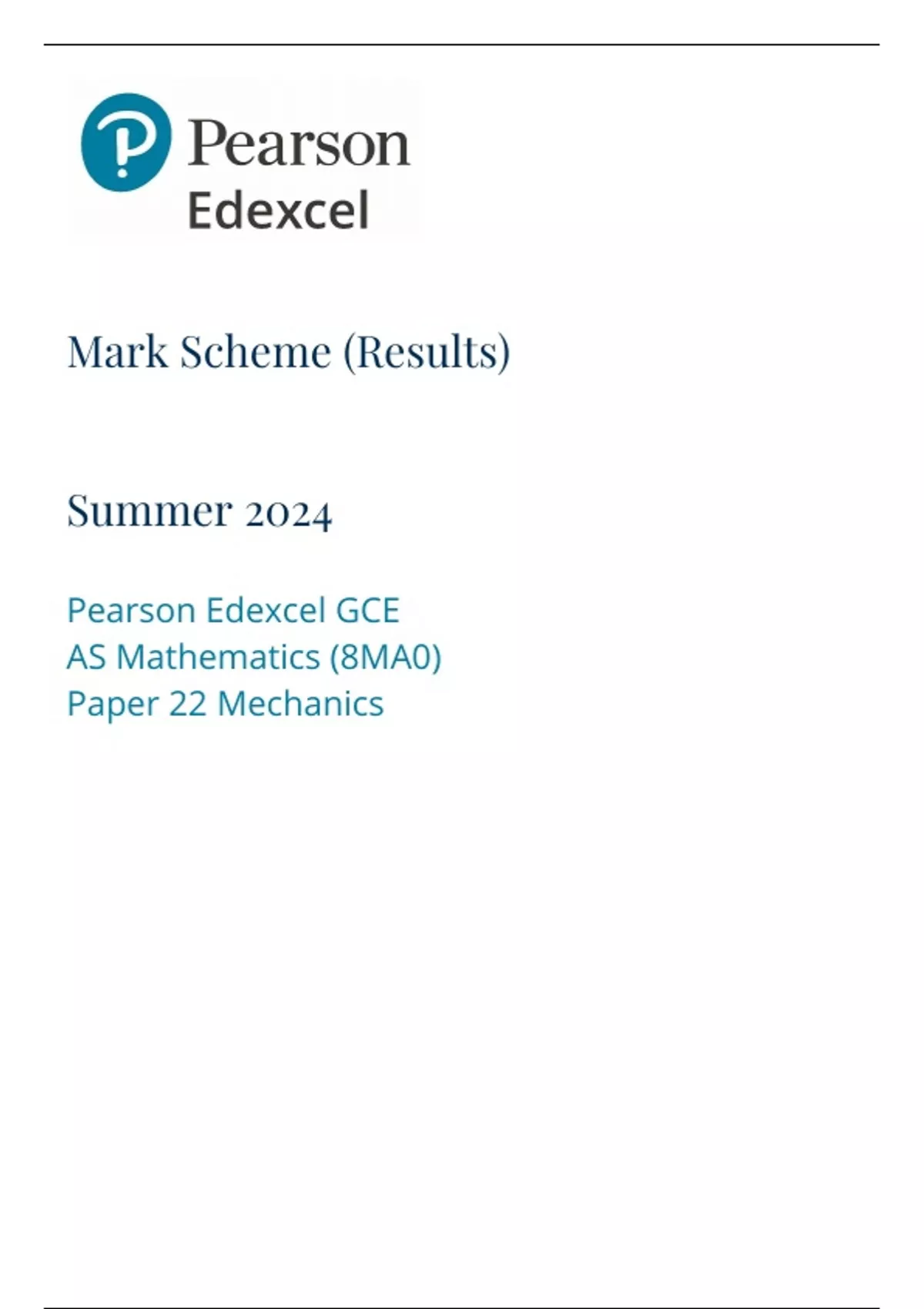 Mark Scheme (Results) Summer 2024 Pearson Edexcel GCE AS Mathematics (8MA0) Paper 22 Mechanics