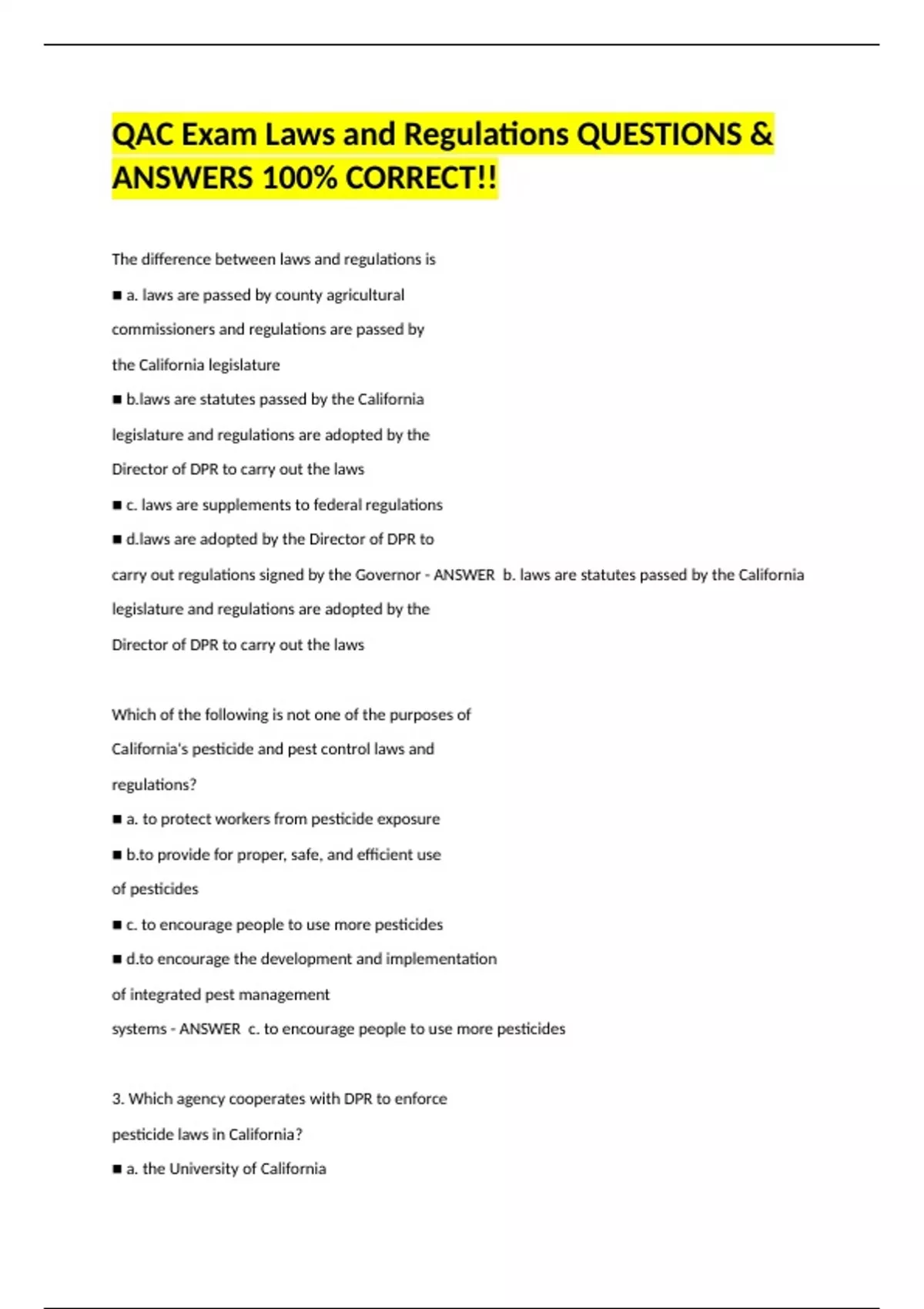 The difference between laws and regulations is ■ a. laws are passed by county agricultural commissioners and regulations are passed by the California legislature ■ are statutes passed by the California legislature and regulations are adopted by the Director of DPR to carry out the laws ■ c. laws are supplements to federal regulations ■ are adopted by the Director of DPR to carry out regulations signed by the Governor - ANSWER b. laws are statutes passed by the California legislature and regulations are adopted by the Director of DPR to carry out the laws Which of the following is not one of the purposes of California's pesticide and pest control laws and regulations? ■ a. to protect workers from pesticide exposure ■ provide for proper, safe, and efficient use of pesticides ■ c. to encourage people to use more pesticides ■ encourage the development and implementation of integrated pest management systems - ANSWER c. to encourage people to use more pesticides