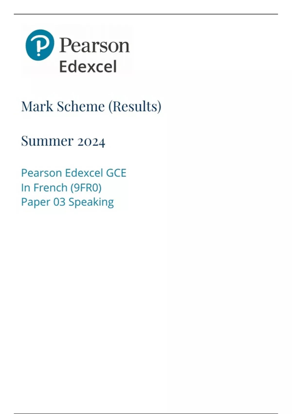 Mark Scheme (Results) Summer 2024 Pearson Edexcel GCE In French (9FR0) Paper 03 Speaking