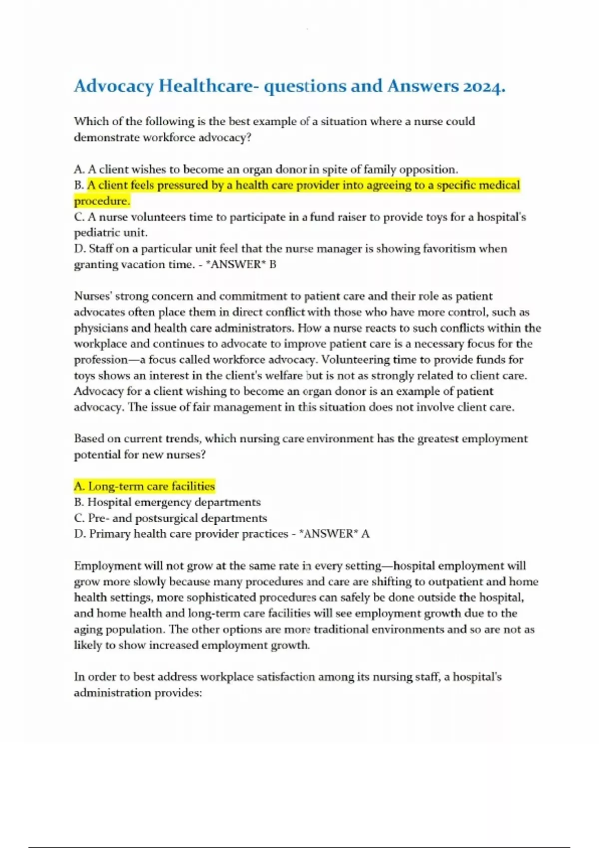 Advocacy Healthcare- questions and Answers 2024. Which of the following is the best example of a situation where a nurse could demonstrate workforce advocacy? A. A client wishes to become an organ donor in spite of family opposition. B. A client feels pressured by a health care provider into agreeing to a specific medical procedure. C. A nurse volunteers time to participate in a fund raiser to provide toys for a hospital's pediatric unit. D. Staff on a particular unit feel that the nurse manager is showing favoritism when granting vacation time. Based on current trends, which nursing care environment has the greatest employment potential for new nurses? A. Long-term care facilities B. Hospital emergency departments C. Pre- and postsurgical departments D. Primary health care provider practices In order to best address workplace satisfaction among its nursing staff, a hospital's administration provides: A. a yearly salary raise. B. tuition reimbursement. C. additional vacation time. D. an extra 15-minute break per shift. Which hospital-wide policy would best address the nurse's negative view of job satisfaction? A. Making it possible to earn additional personal leave time based on their absentee records B. Providing a dedicated parking area close to the hospital for nursing staff C. Instituting biannual staff recognition days that include a free meal in the cafeteria D. Providing security backup when there is a perceived sense of workplace violence - In order to best ensure client safety, which of the following questions should a staff nurse ask first when determining whether to accept a client assignment that is made when several staff members have reported off sick? A. "Do I have the experience and knowledge to care for these patients?" B. "Is this a staffing crisis or a result of typical staffing patterns?" C. "Can I expect to be mandated to stay an additional shift?" D. "How long will it be before I get additional help?" Your adult patient is scheduled for an x-ray film of the head. He is refusing to go, despite the fact that the x-ray film will give vital information related to his chief complaint of a headache. The nurse learns of the patient's refusal and comes in to the patient's room saying, "If you don't go to this x-ray, I'll have to give you a shot to put you out." In your opinion, has the nurse committed a legal mistake? A. No, the nurse is acting in the best interests of the patient who needs the test to treat him. B. No, the nurse is merely trying to help the patient understand the necessity of cooperating with the ordered treatment regimen. C. Yes, the nurse may have committed an assault on the patient by verbally threatening him. D. Yes, the nurse may have committed malpractice by forcing the patient to do something against his will. A nurse has received a letter from the State Board of Nursing in which he practices that he has been placed on probation and that his license is suspended. The nurse has received no other information about this action. What, if any, claims does this nurse have? A. The nurse has a claim against the State Board of Nursing for a violation of his right to privacy. B. The nurse has a claim against the State Board of Nursing for violating his rights to due process. C. The nurse has a claim against the hospital where he works for failing to represent him in a civil law suit. D. The nurse has no claim against the State Board of Nursing and the hospital. - A patient's daughter is speaking to the nurse caring for her father. The daughter has presented the nurse with a document identifying her as the spokesperson for the patient when he is no longer capable of speaking for himself. Which of the following best characterizes the daughter's legal relationship with her ailing father? A. Health care proxy B. Legal Samaritan C. Guardian ad litem D. Attorney A patient is discussing her surgery with her surgeon. The physician leaves and asks you to have the patient sign the consent form in a few hours. Which statement made by the patient indicates that informed consent has likely been achieved? A. The patient states that the doctor has told her there is nothing more they can do and she is going home. B. The patient states that she has not spoken with her surgeon at all today. C. The patient states that her surgeon has told her that she doesn't need surgery. D. The patient states that she is having surgery on her leg in the morning and that she will have some pain and bleeding for a few days. A nurse believes that a pediatric patient has been the victim of abuse based on verbal statements and scarring noted on the patient's abdomen and legs. Which of the following is the best action for the nurse to take? A. Do nothing but document the patient's condition. B. Contact the patient's family. C. Contact the patient's teacher. D. Contact the Child Abuse Hotline. A health care provider has written an order for a patient to receive a medication every 6 hours for 7 days. You note that the patient has indicated that she is allergic to this medication (rash, shortness of breath). Which of the following should you do first? A. Contact the health care provider. B. Contact the pharmacist. C. Place a "hold" note on the medication administration record (MAR). D. Contact the nursing supervisor. A patient's visitor has fallen in the patient's room. Which of the following is the most appropriate action for the nurse to take? A. Call the nursing supervisor. B. Assist the visitor and document with an occurrence report. C. Assist the visitor and, if there is no injury, document nothing. D. Assist the visitor and document the occurrence in the patient's chart. Although you normally work in a hospital setting, you have volunteered at a homeless shelter at a blood pressure clinic. If an incident occurs at the blood pressure clinic, what is your most likely liability protection provider? A. Your employer hospital malpractice insurance B. Your home insurance C. Your professional liability
