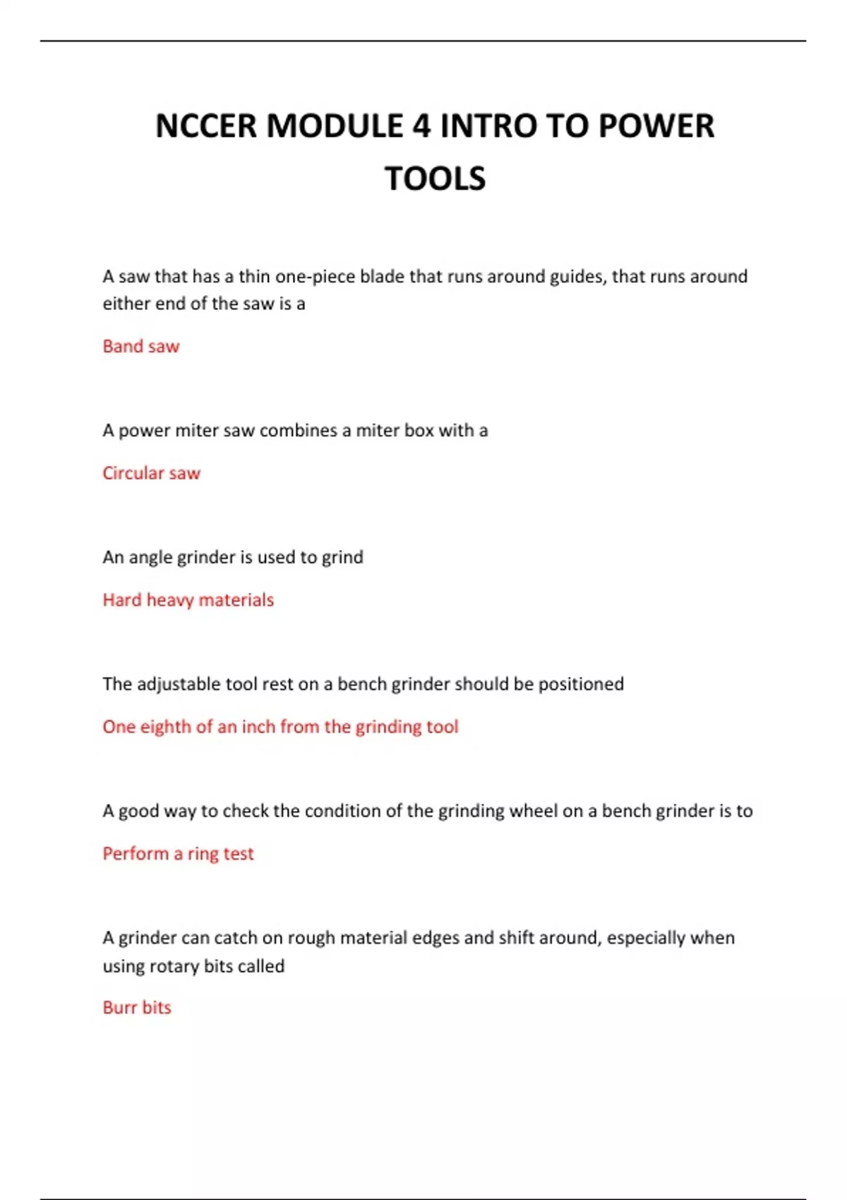 NCCER MODULE 4 INTRO TO POWER TOOLS 2024 QUESTIONS AND ANSWERS